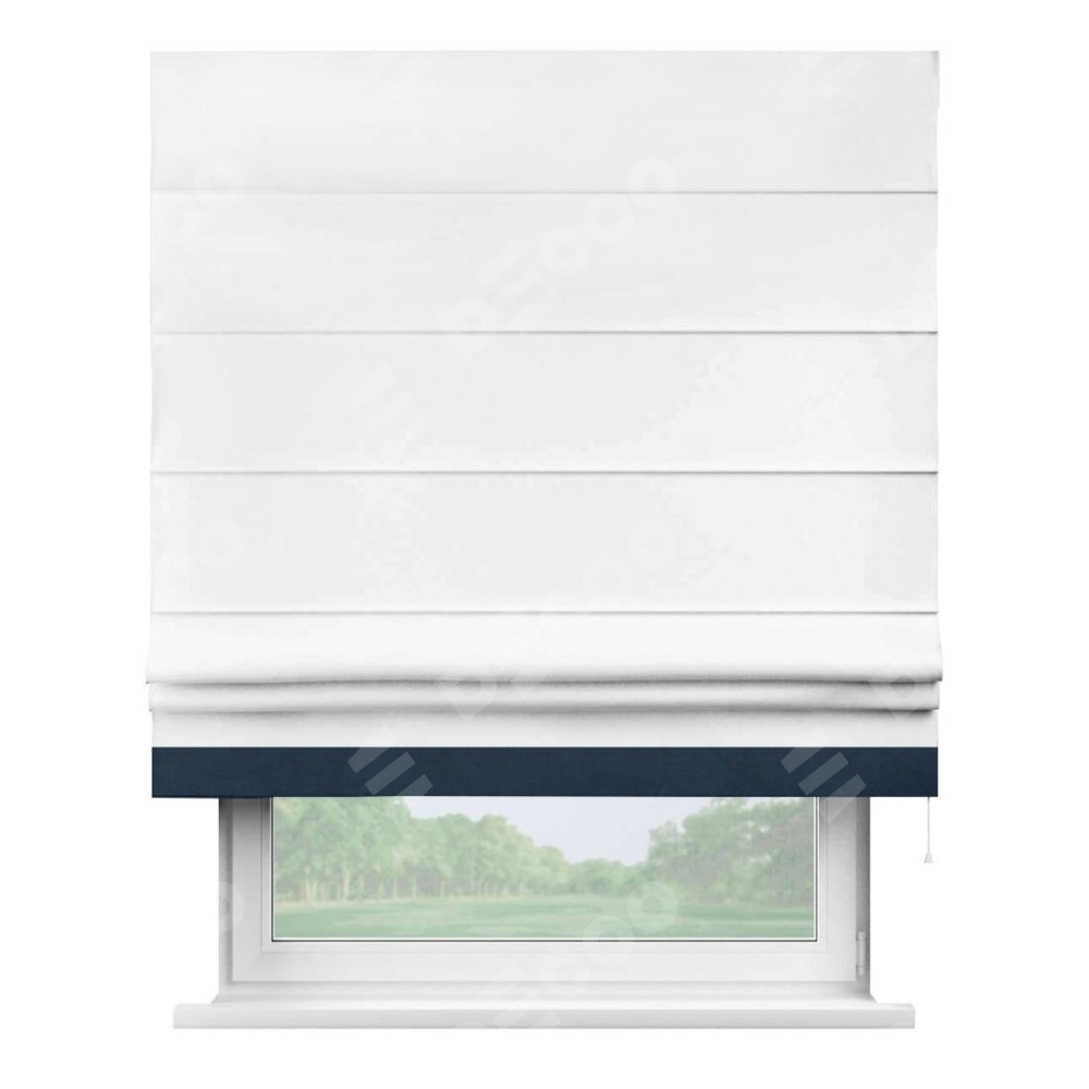 Римская штора производителя «Cortin», используется для проёма, пошита из ткани вельвет белоснежный, артикул ткани 19192. Отделка шторы кантом «Джестер», ткань для канта используется из вельвета разной расцветки на выбор. Имеет универсальный механизм и подходит для монтажа: на потолок, на стену и в нишу.