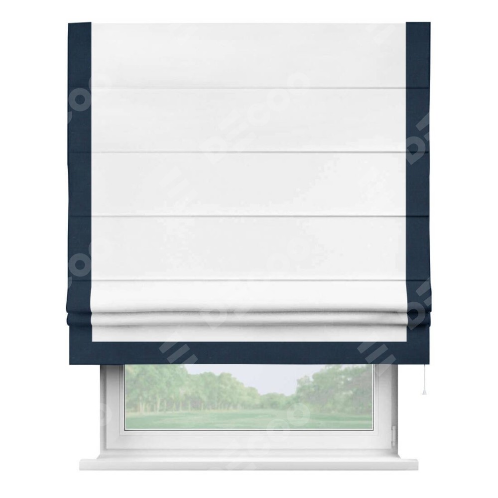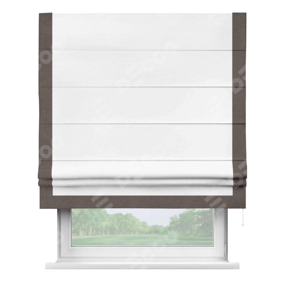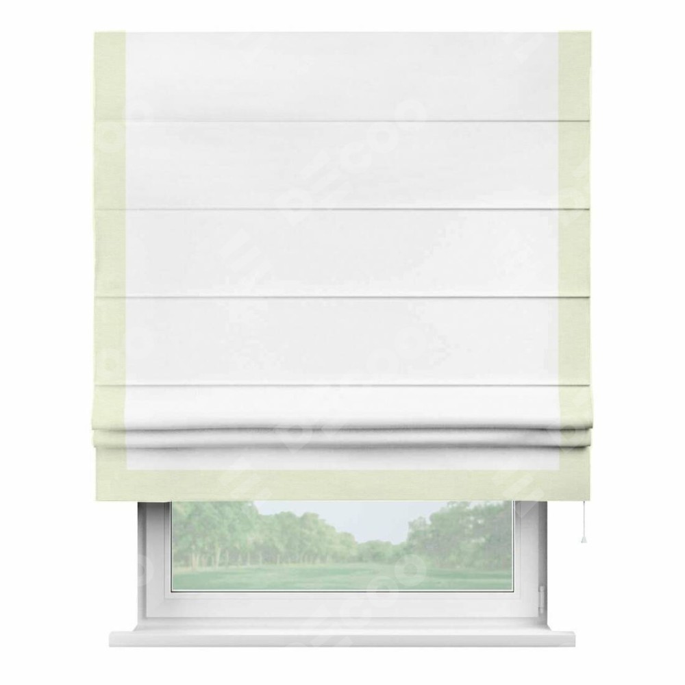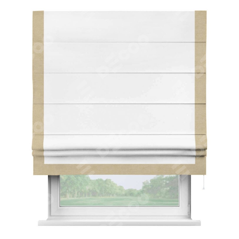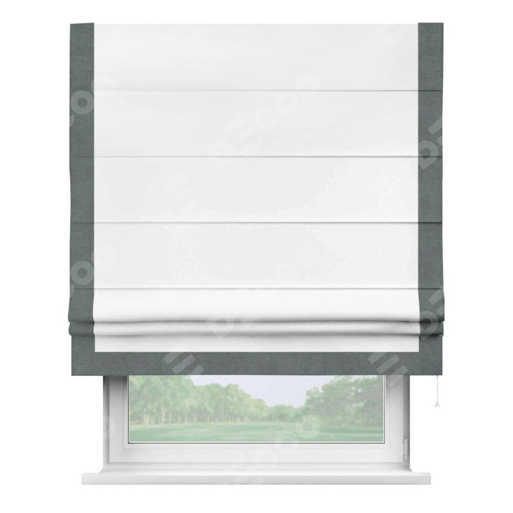 Римская штора производителя «Cortin», используется для проёма, пошита из ткани вельвет белоснежный, артикул ткани 19192. Отделка шторы кантом «Виктория», ткань для канта используется из вельвета разной расцветки на выбор. Имеет универсальный механизм и подходит для монтажа: на потолок, на стену и в нишу.