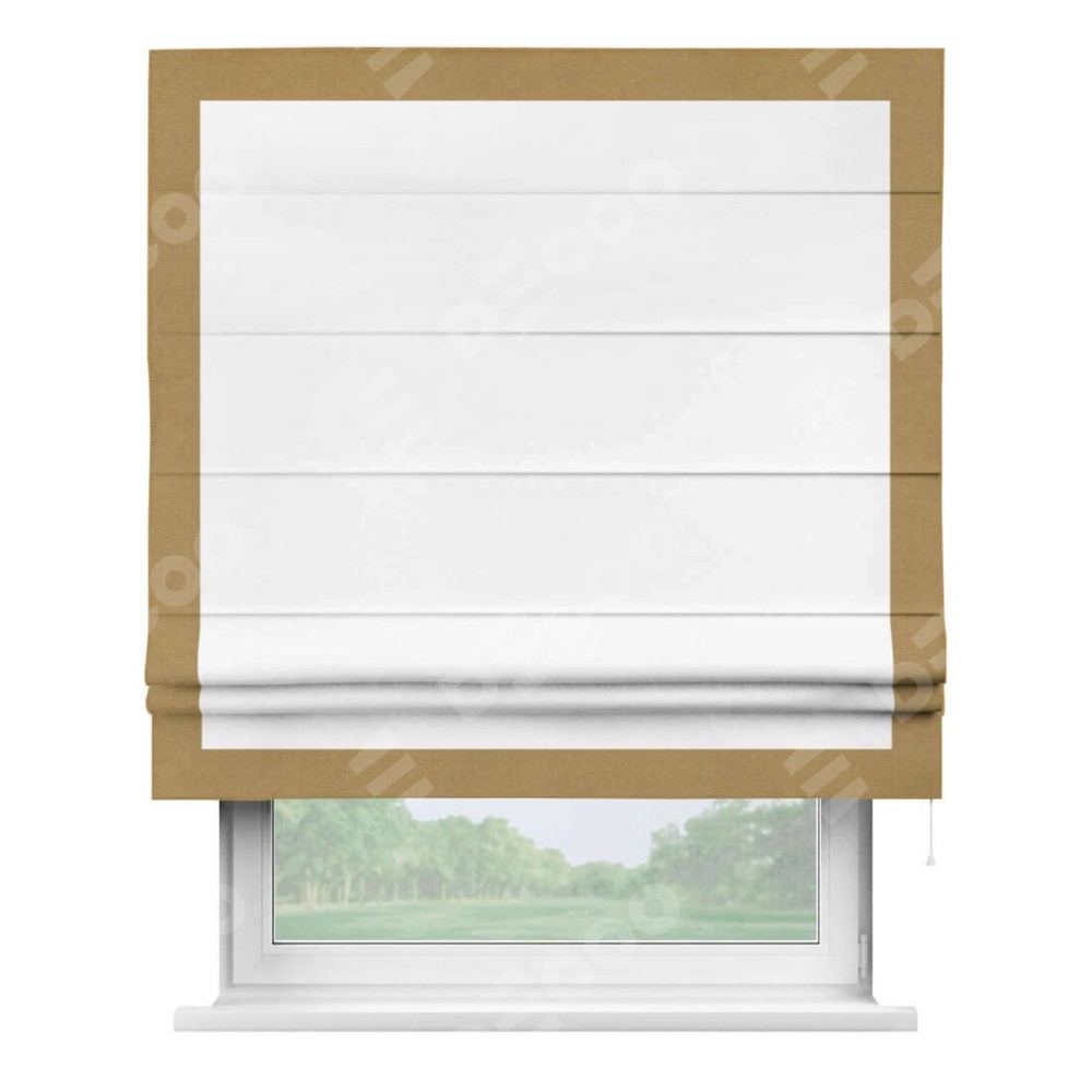 Римская штора производителя «Cortin», используется для проёма, пошита из ткани вельвет белоснежный, артикул ткани 19192. Отделка шторы кантом «Чесс», ткань для канта используется из вельвета разной расцветки на выбор. Имеет универсальный механизм и подходит для монтажа: на потолок, на стену и в нишу.