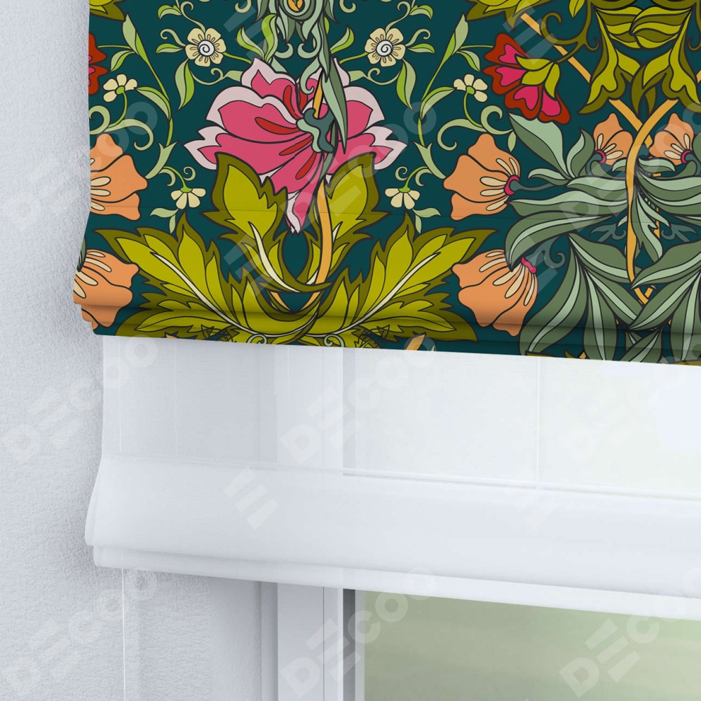 Римская штора день-ночь производителя «Cortin», используется для проёма, пошита из двух полотен, с лицевой блэкаут с нанесением сублимационной печати «Цветок морриса», вторая ткань тюль (по стандарту комплектуется тюль белого цвета артикул V-01). Имеет универсальный механизм и подходит для монтажа: на потолок, на стену и в нишу.