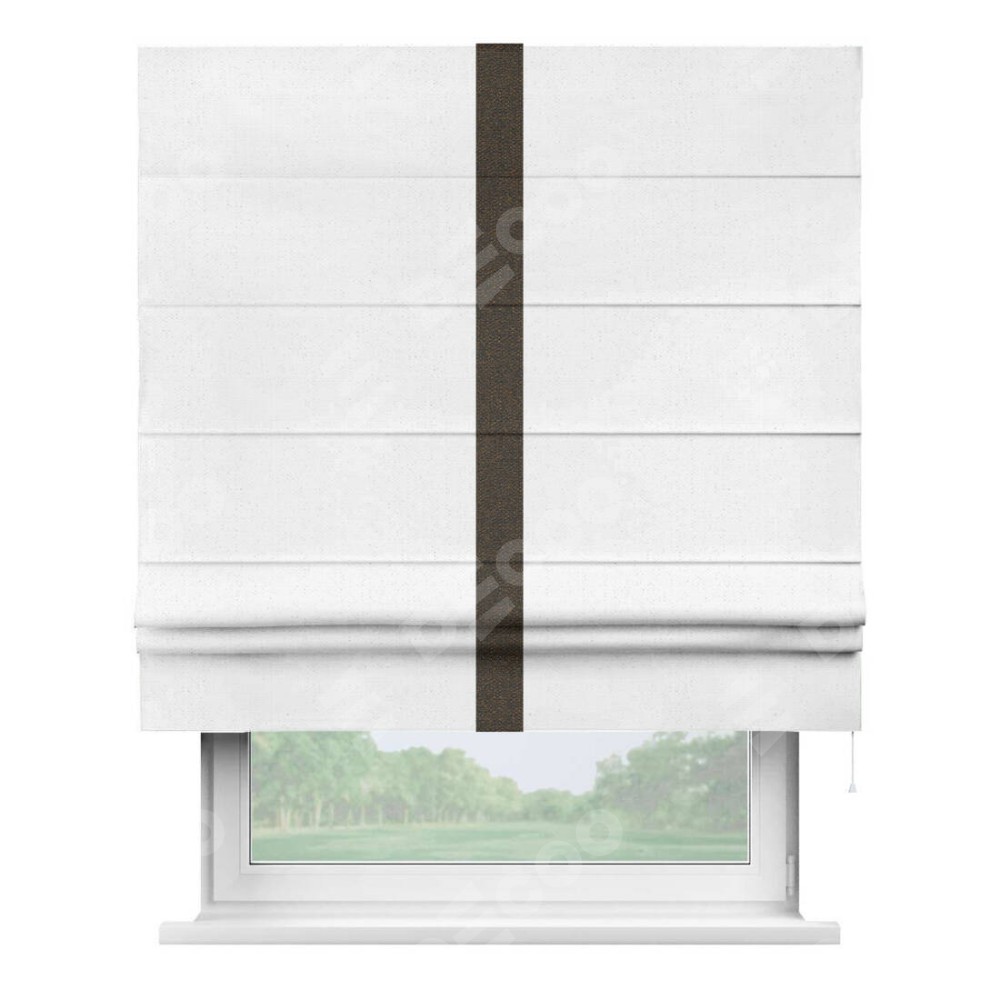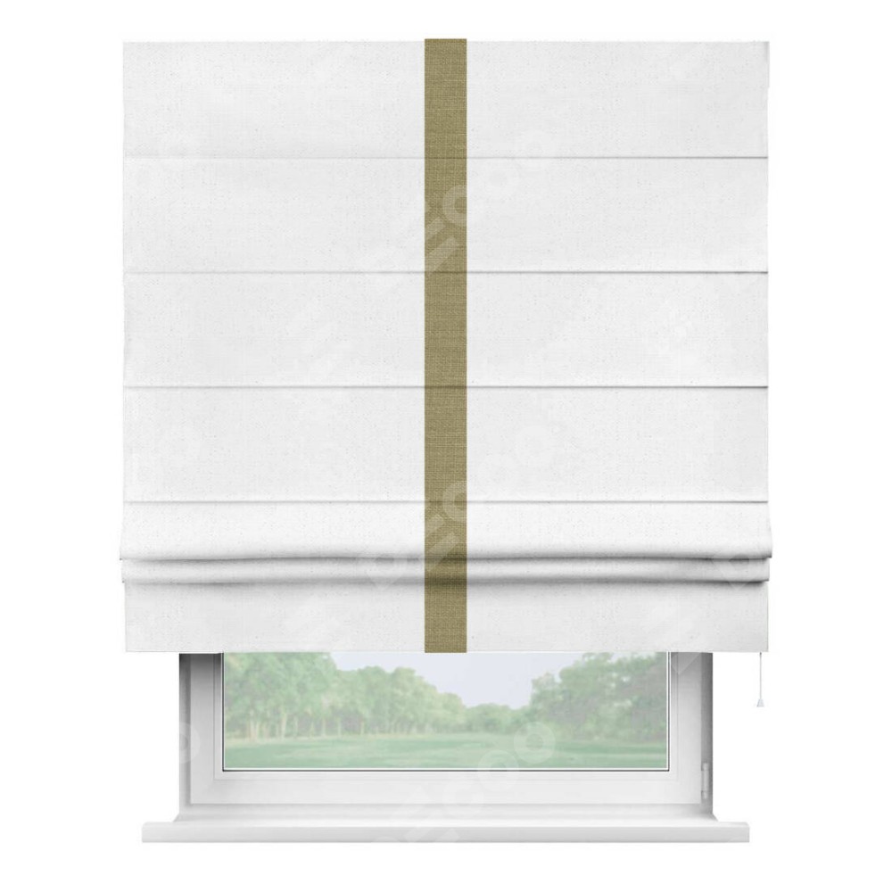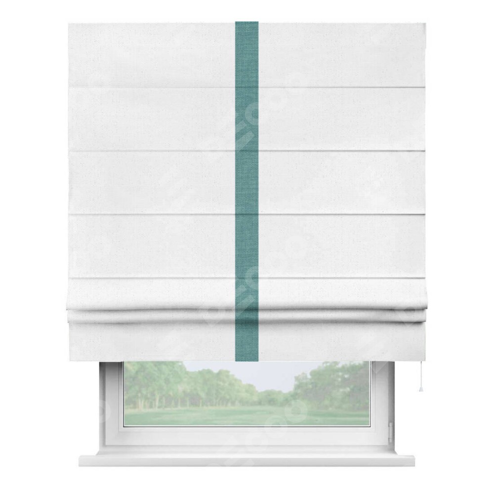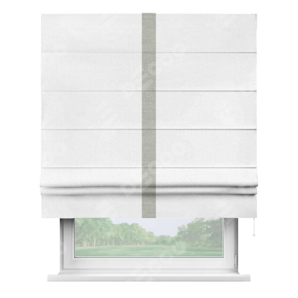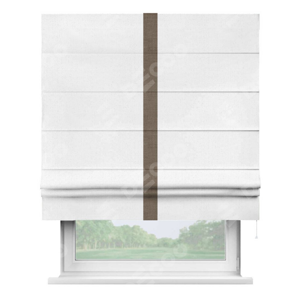 Римская штора производителя «Cortin», используется для проёма, пошита из ткани лён белый, артикул 7439. Отделка шторы кантом «Хайвэй», ткань для канта используется из льна разной расцветки на выбор. Имеет универсальный механизм и подходит для монтажа: на потолок, на стену и в нишу.
