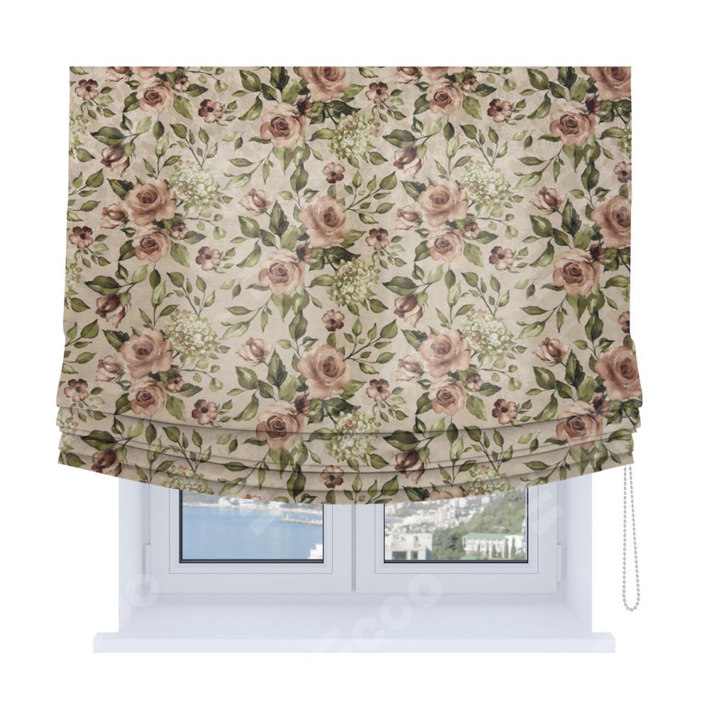 Римская штора Soft производителя «Cortin», используется для проёма, пошита из ткани «Розы бежевые», артикул ткани 34564. Имеет универсальный механизм и подходит для монтажа: на потолок, на стену и в нишу. В отличие от стандартных римских штор, римская штора Soft не имеет горизонтальных вставок и нижнего отвеса. Это позволяет ткани произвольно драпироваться в свободные мягкие складки.