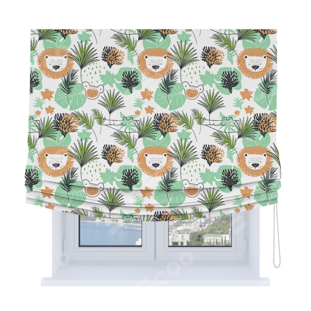 Римская штора Soft производителя «Cortin», используется для проёма, пошита из ткани блэкаут с нанесением сублимационной печати «Животные из джунглей». Имеет универсальный механизм и подходит для монтажа: на потолок, на стену и в нишу. В отличие от стандартных римских штор, римская штора Soft не имеет горизонтальных вставок и нижнего отвеса. Это позволяет ткани произвольно драпироваться в свободные мягкие складки.