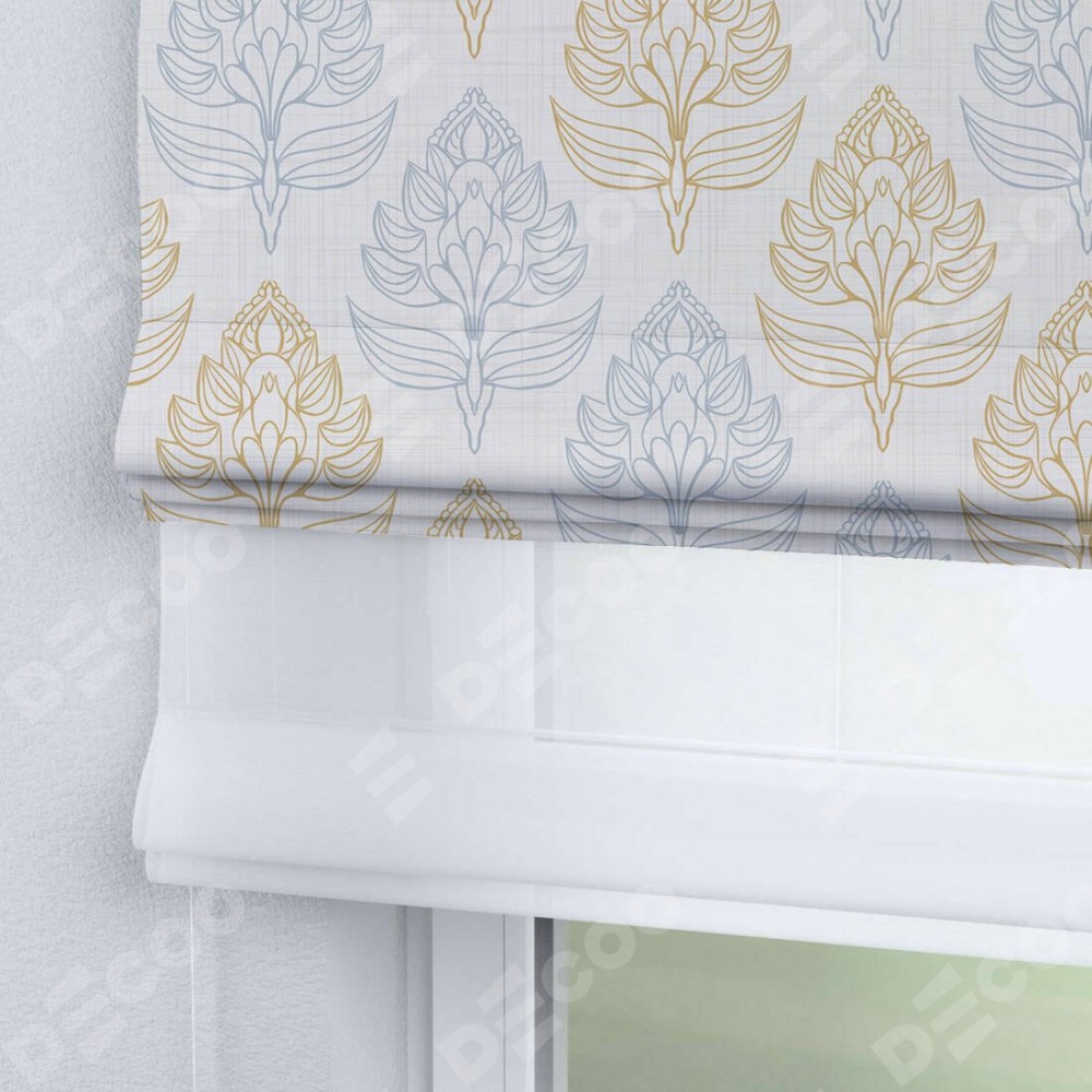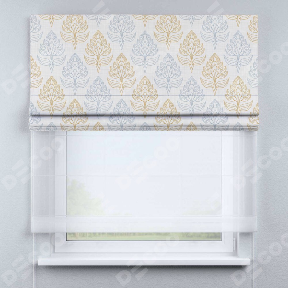 Римская штора день-ночь производителя «Cortin», используется для проёма, пошита из двух полотен, с лицевой блэкаут с нанесением сублимационной печати «Цветочный медальон», вторая ткань тюль (по стандарту комплектуется тюль белого цвета артикул V-01). Имеет универсальный механизм и подходит для монтажа: на потолок, на стену и в нишу.