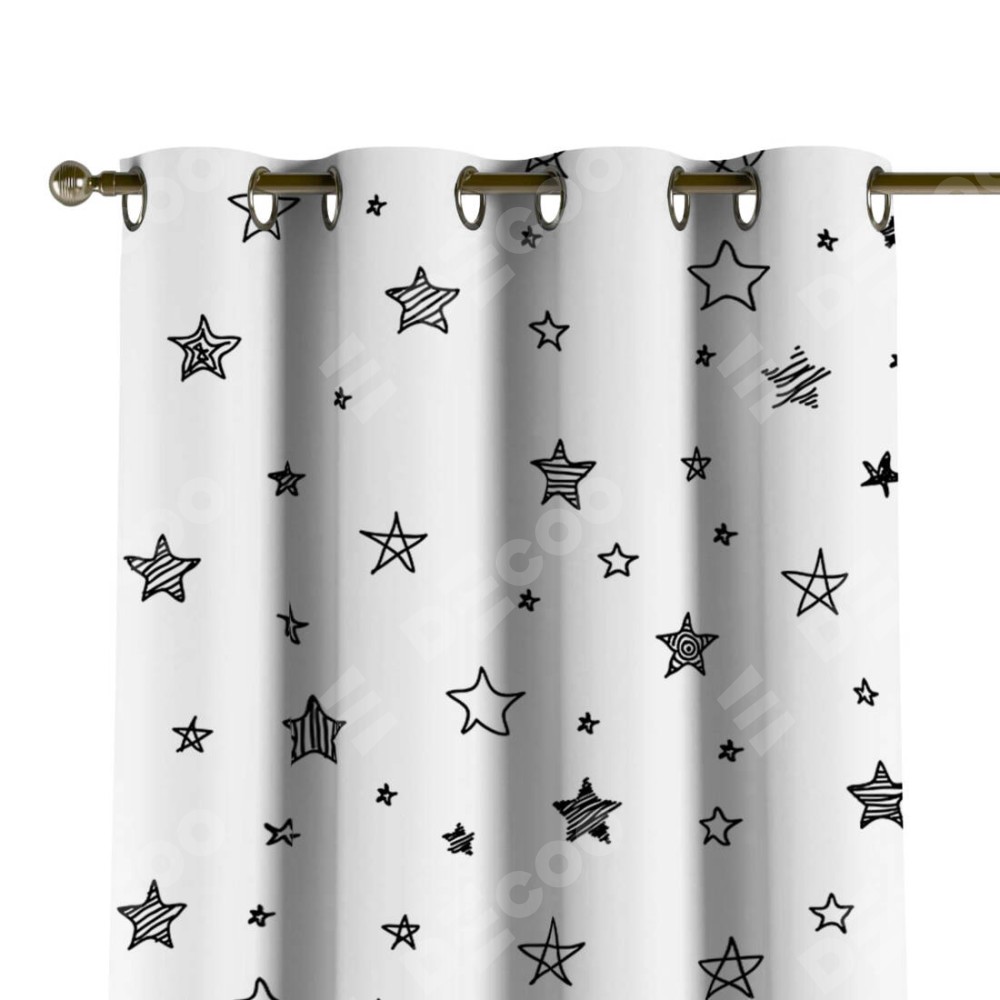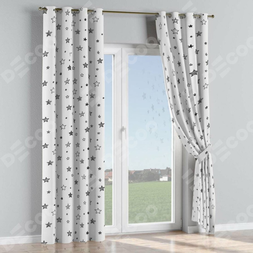 Комплект прямых штор, от производителя «Cortin», пошиты из ткани блэкаут с нанесением сублимационной печати «Звёзды». Данная модель пошита на люверсах, комплектуется на выбор круглым карнизом и подходит для монтажа на стену или потолок. Прямые шторы на люверсах шьются по стандарту с коэффициентом 1/2 (на 100 см. ширины проёма 200 см. ширины ткани), отличительным преимуществом данной модели является простой способ монтажа. Достаточно повесить ее на трубу и штора готова!