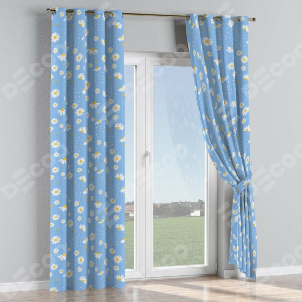 Комплект прямых штор, от производителя «Cortin», пошиты из ткани блэкаут с нанесением сублимационной печати «Ромашки на голубом». Данная модель пошита на люверсах, комплектуется на выбор круглым карнизом и подходит для монтажа на стену или потолок. Прямые шторы на люверсах шьются по стандарту с коэффициентом 1/2 (на 100 см. ширины проёма 200 см. ширины ткани), отличительным преимуществом данной модели является простой способ монтажа. Достаточно повесить ее на трубу и штора готова!