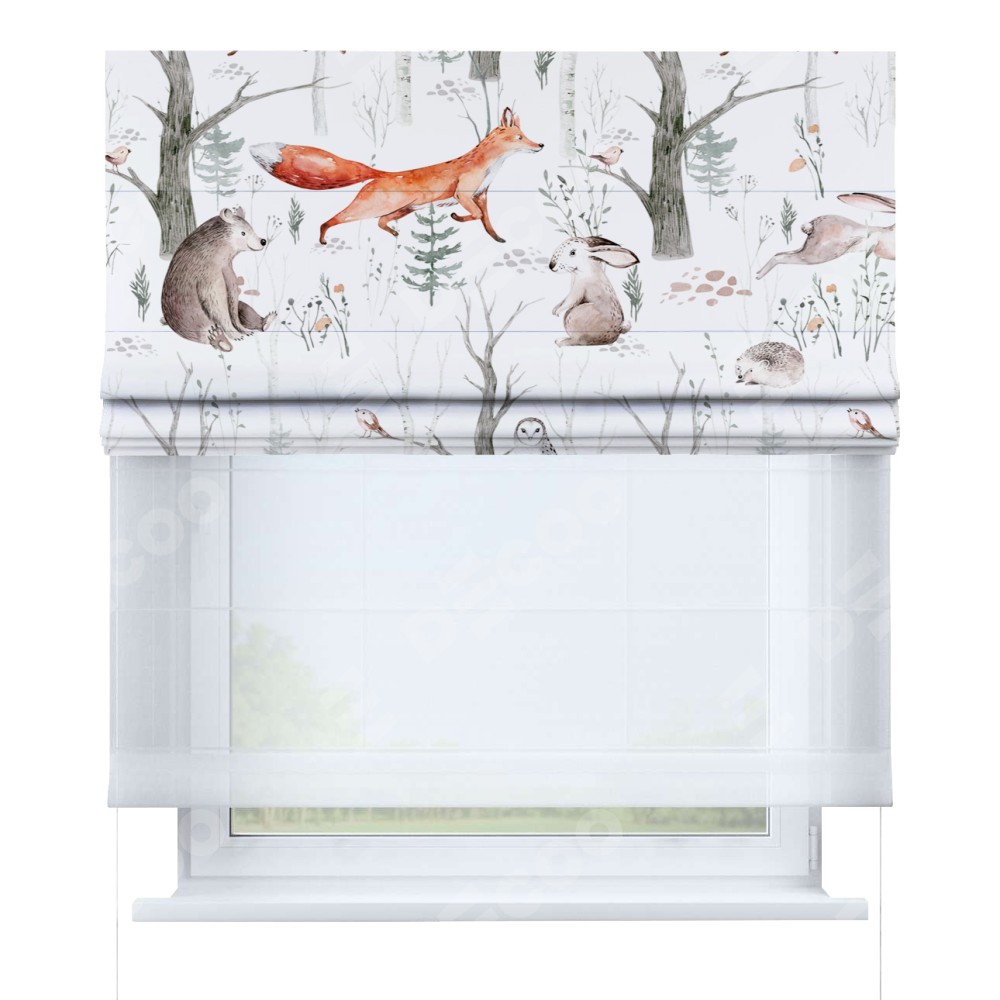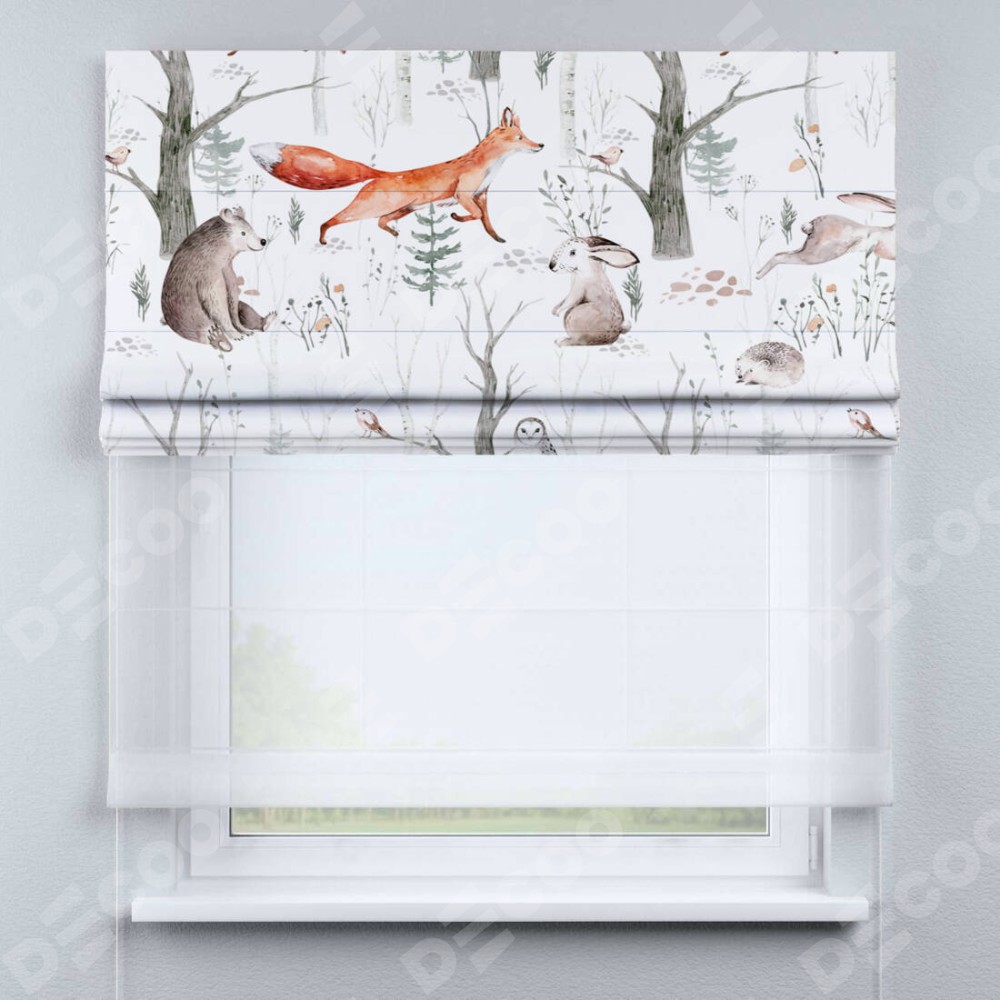 Римская штора день-ночь производителя «Cortin», используется для проёма, пошита из двух полотен, с лицевой блэкаут с нанесением сублимационной печати «Лесной питомник», вторая ткань тюль (по стандарту комплектуется тюль белого цвета артикул V-01). Имеет универсальный механизм и подходит для монтажа: на потолок, на стену и в нишу.