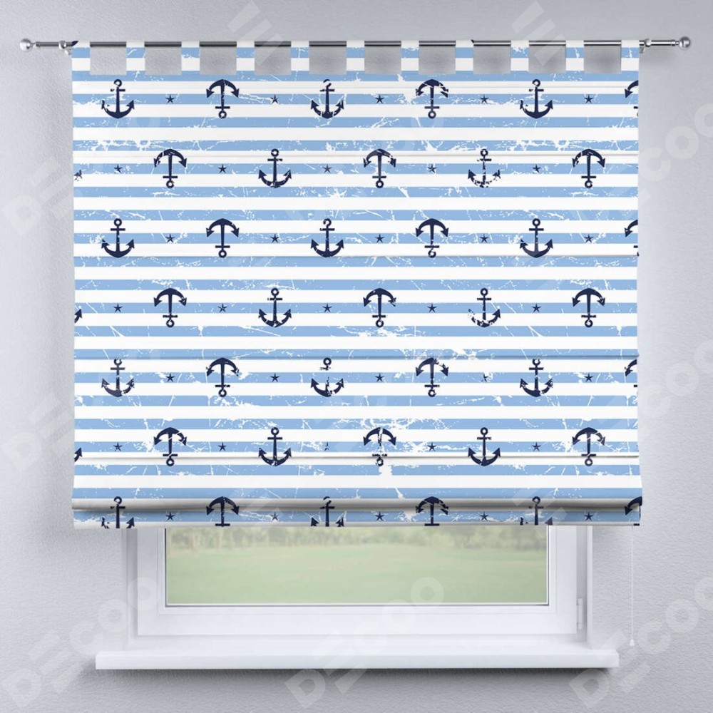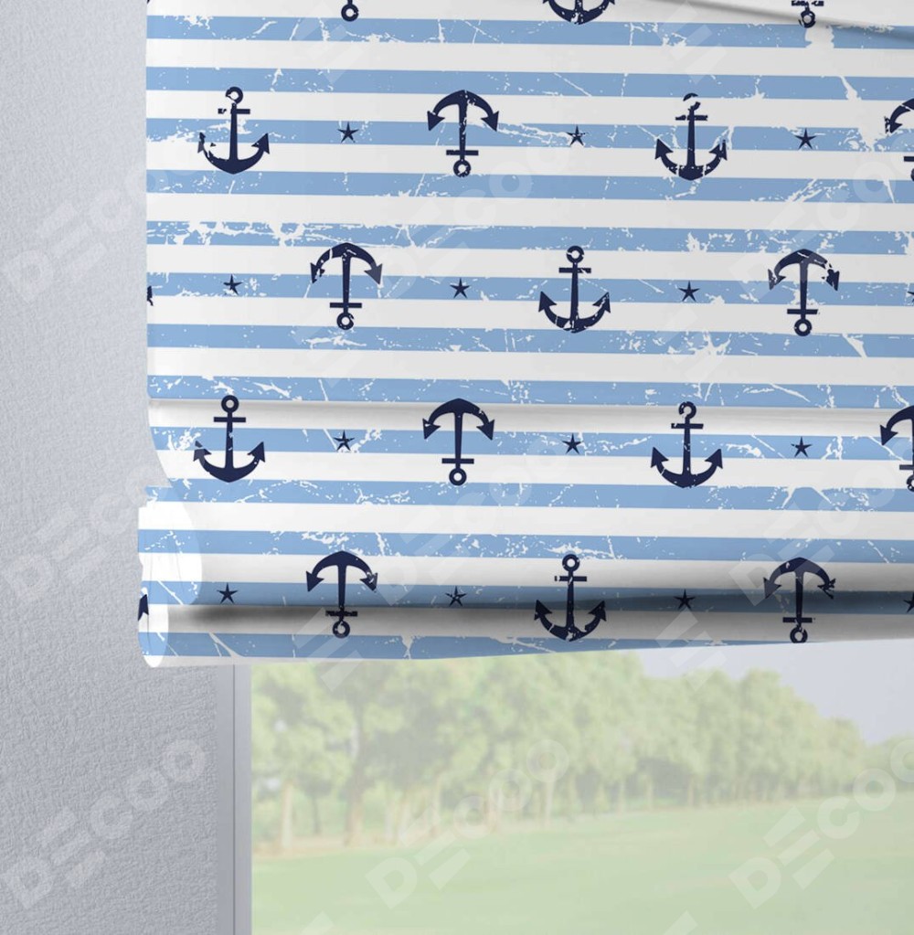 Римская штора производителя «Cortin», используется для проёма, пошита из ткани блэкаут с нанесением сублимационной печати «Полоски и якори». Данная модель пошита на петлях, комплектуется на выбор круглым карнизом и подходит для монтажа на стену. Римская штора на петлях имеет простую систему регулировки высоты, отличительным преимуществом данной модели является простой способ монтажа. Достаточно повесить ее на трубу и штора готова!