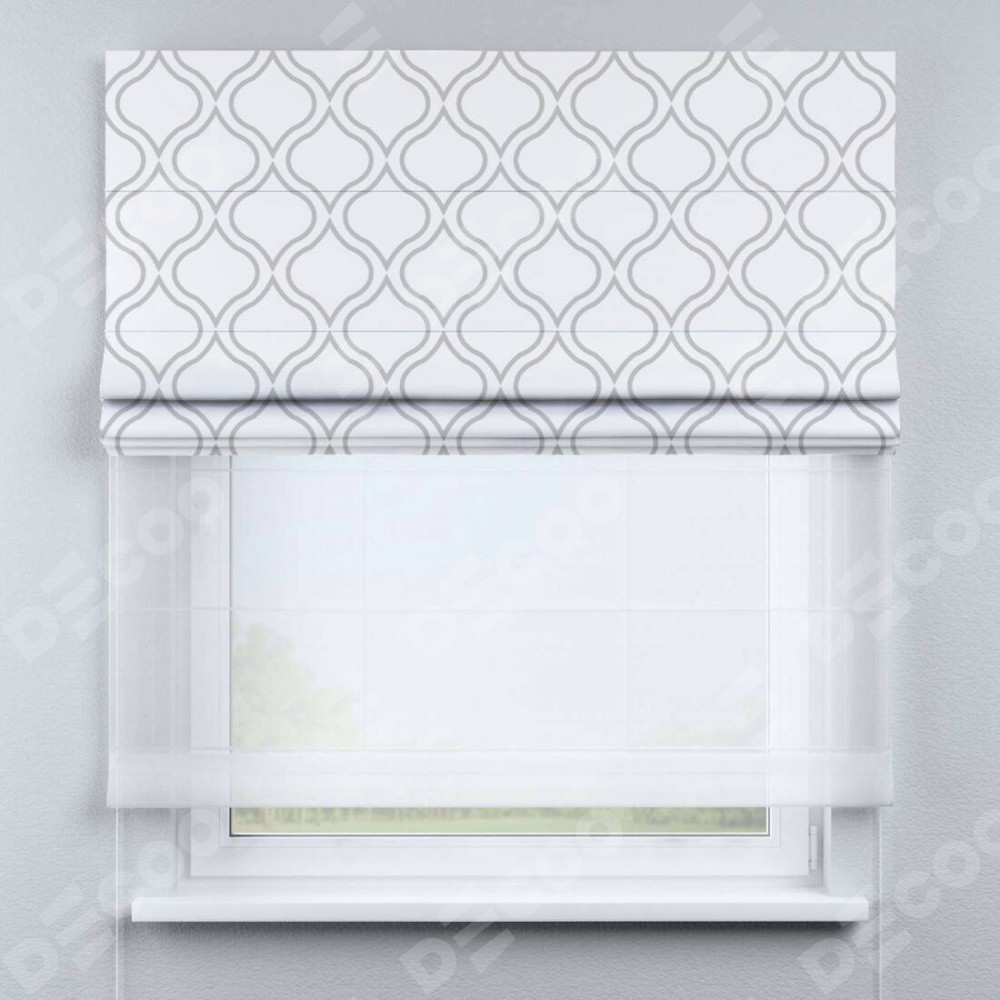 Римская штора день-ночь производителя «Cortin», используется для проёма, пошита из двух полотен, с лицевой блэкаут с нанесением сублимационной печати «Тайны востока белый», вторая ткань тюль (по стандарту комплектуется тюль белого цвета артикул V-01). Имеет универсальный механизм и подходит для монтажа: на потолок, на стену и в нишу.