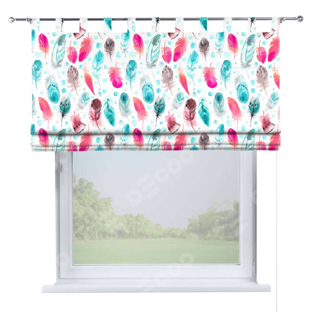 Римская штора производителя «Cortin», используется для проёма, пошита из ткани блэкаут с нанесением сублимационной печати «Перья». Данная модель пошита на петлях, комплектуется на выбор круглым карнизом и подходит для монтажа на стену. Римская штора на петлях имеет простую систему регулировки высоты, отличительным преимуществом данной модели является простой способ монтажа. Достаточно повесить ее на трубу и штора готова!