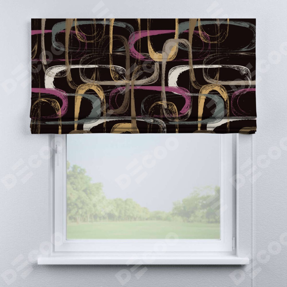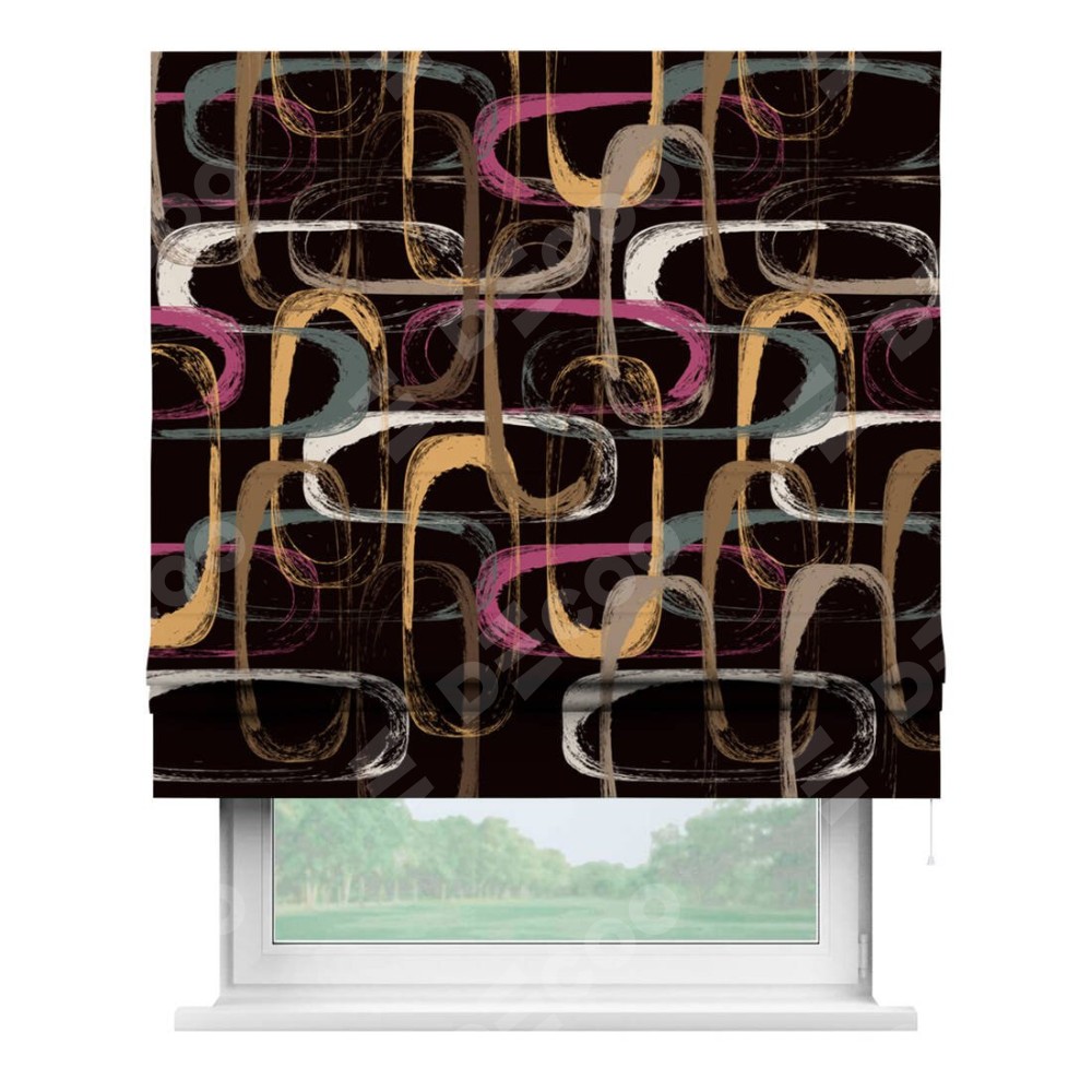 Римская штора производителя «Cortin», используется для проёма, пошита из ткани блэкаут с нанесением сублимационной печати «Тёмная палитра». Имеет универсальный механизм и подходит для монтажа: на потолок, на стену и в нишу.