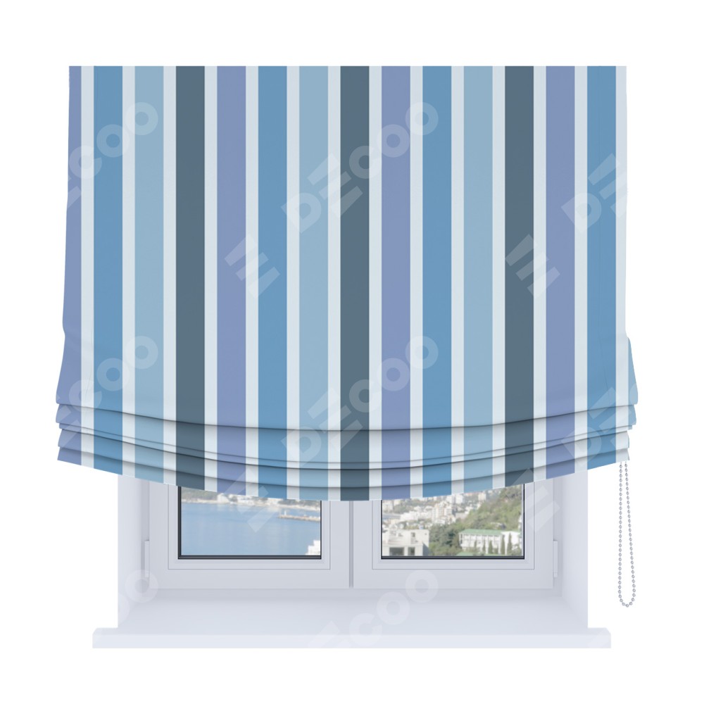 Римская штора Soft производителя «Cortin», используется для проёма, пошита из ткани блэкаут с нанесением сублимационной печати «Сине-голубые вертикальные полоски». Имеет универсальный механизм и подходит для монтажа: на потолок, на стену и в нишу. В отличие от стандартных римских штор, римская штора Soft не имеет горизонтальных вставок и нижнего отвеса. Это позволяет ткани произвольно драпироваться в свободные мягкие складки.