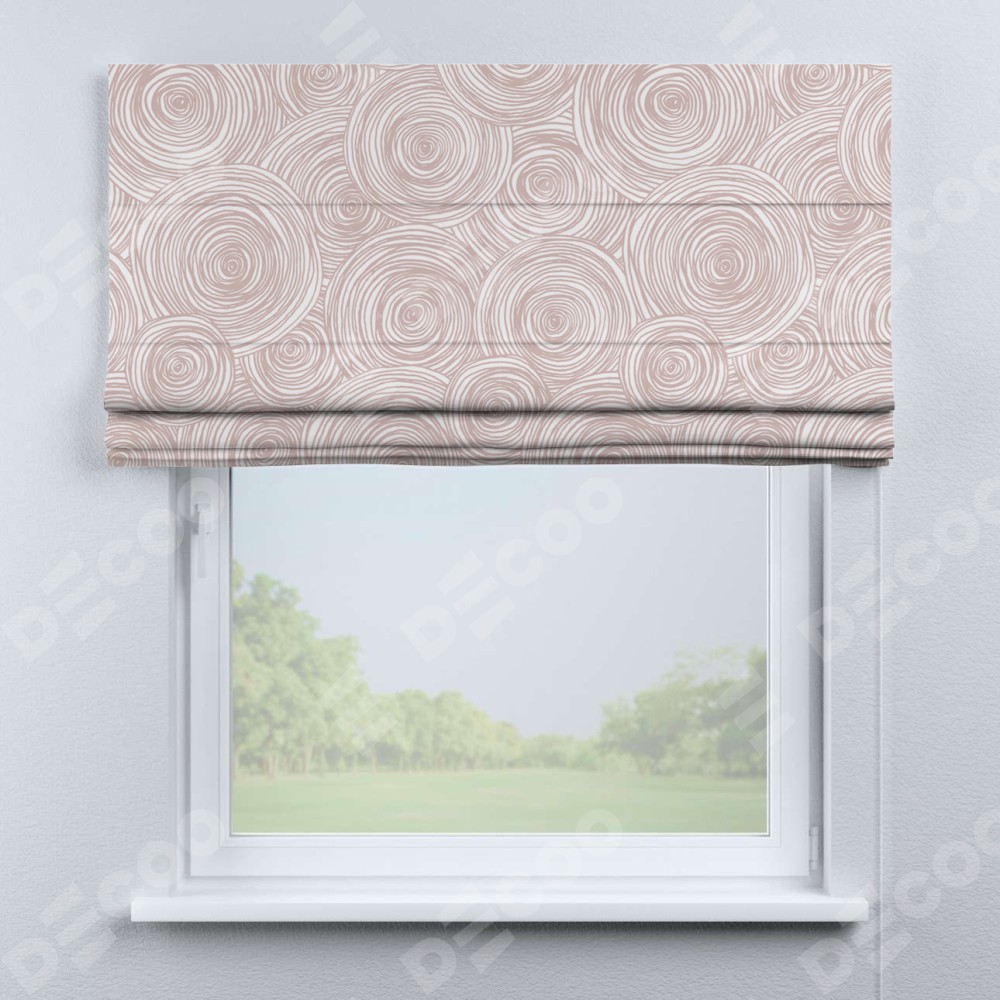 Римская штора производителя «Cortin», используется для проёма, пошита из ткани блэкаут с нанесением сублимационной печати «Бежевые круги». Имеет универсальный механизм и подходит для монтажа: на потолок, на стену и в нишу.