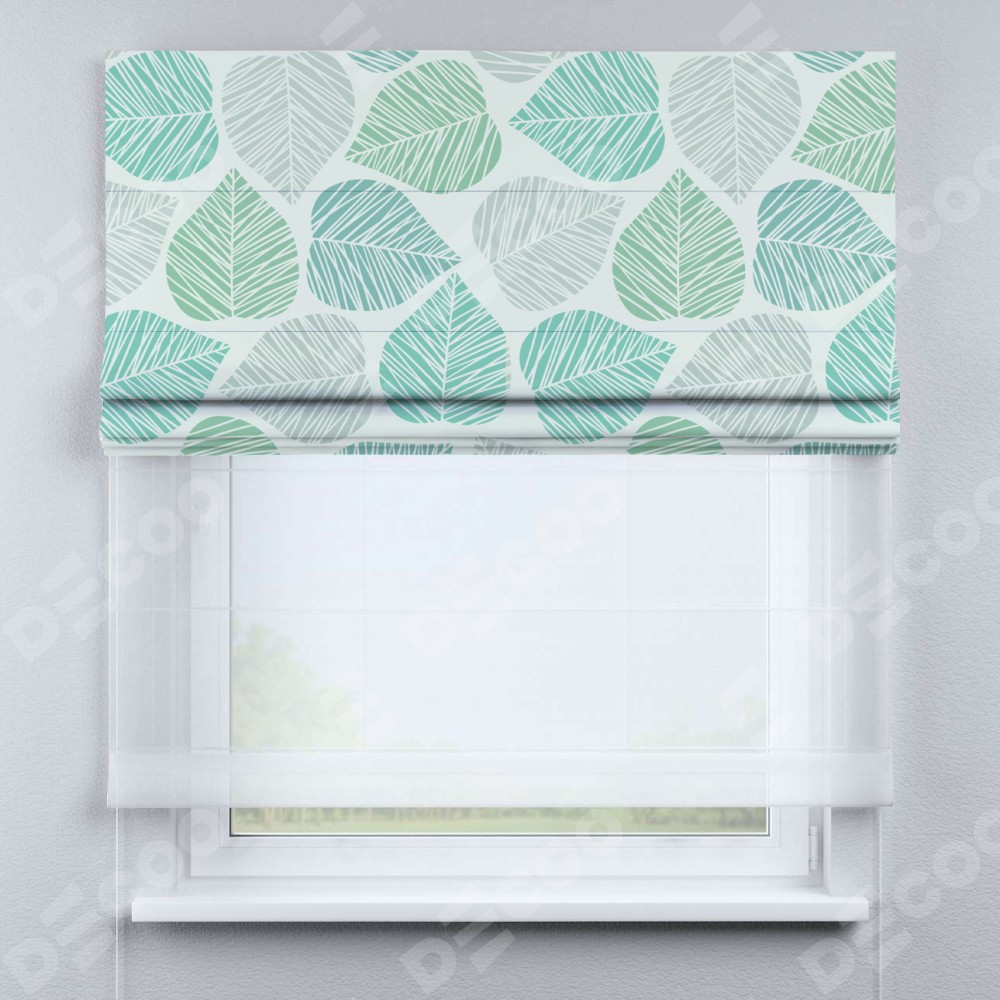 Римская штора день-ночь производителя «Cortin», используется для проёма, пошита из двух полотен, с лицевой блэкаут с нанесением сублимационной печати «Весенняя листва», вторая ткань тюль (по стандарту комплектуется тюль белого цвета артикул V-01). Имеет универсальный механизм и подходит для монтажа: на потолок, на стену и в нишу.