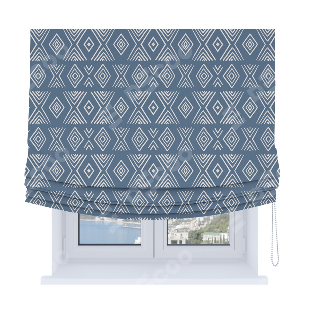 Римская штора Soft производителя «Cortin», используется для проёма, пошита из ткани блэкаут с нанесением сублимационной печати «Графический орнамент». Имеет универсальный механизм и подходит для монтажа: на потолок, на стену и в нишу. В отличие от стандартных римских штор, римская штора Soft не имеет горизонтальных вставок и нижнего отвеса. Это позволяет ткани произвольно драпироваться в свободные мягкие складки.