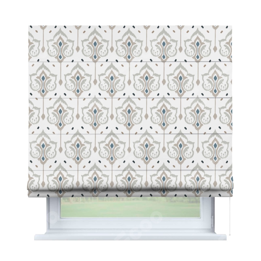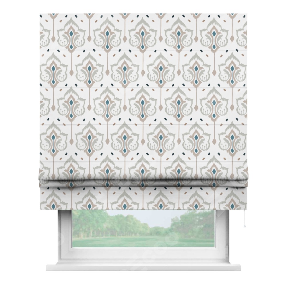 Римская штора производителя «Cortin», используется для проёма, пошита из ткани блэкаут с нанесением сублимационной печати «Икат узор». Имеет универсальный механизм и подходит для монтажа: на потолок, на стену и в нишу.