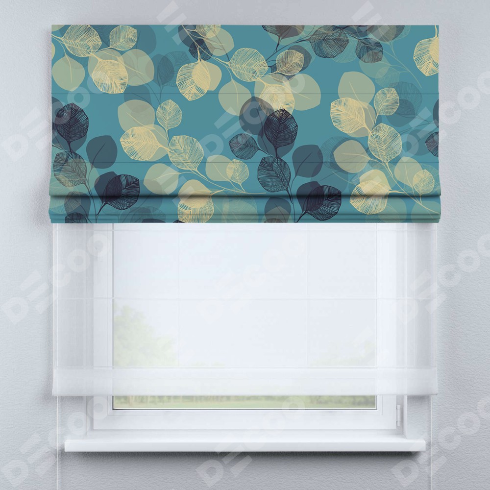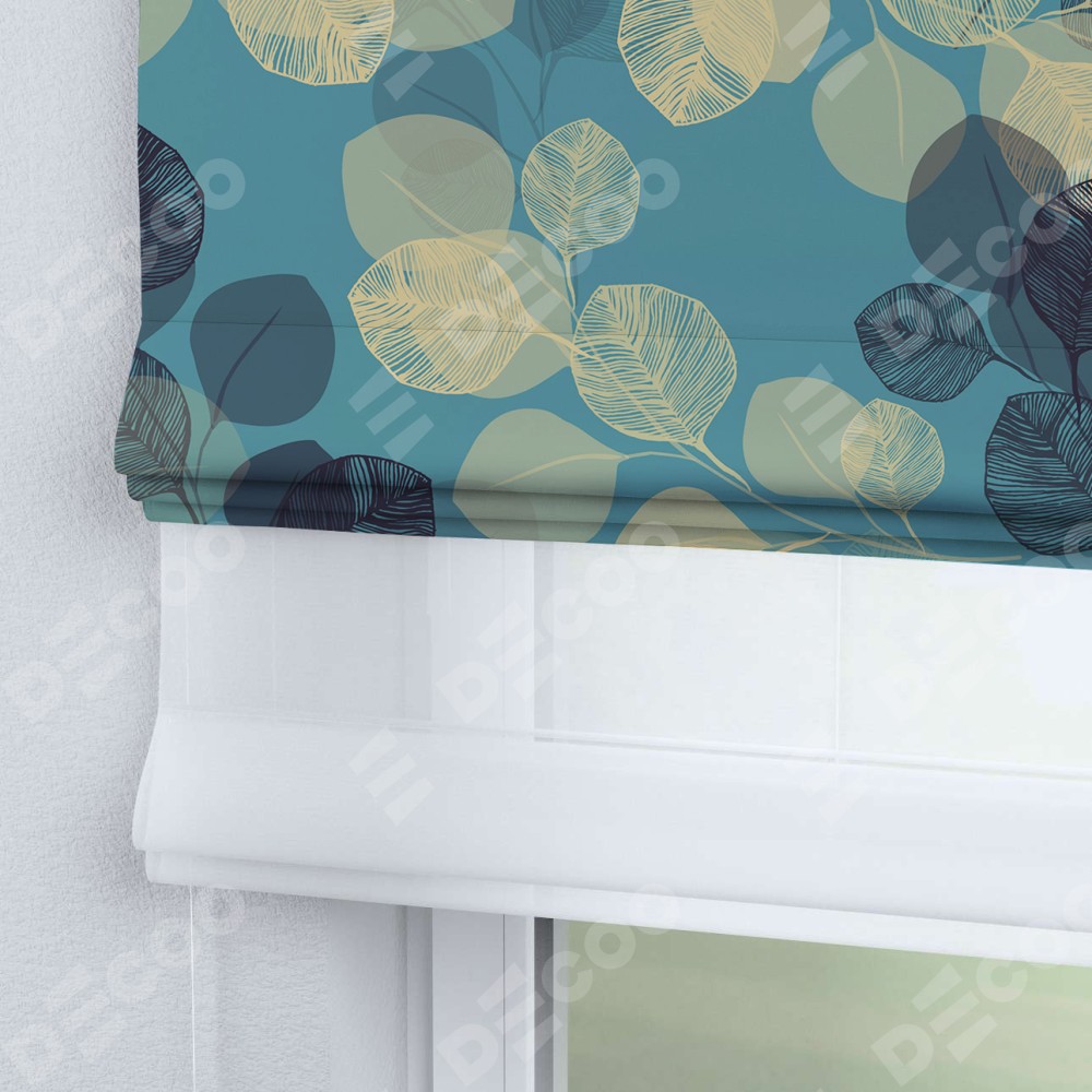 Римская штора день-ночь производителя «Cortin», используется для проёма, пошита из двух полотен, с лицевой блэкаут с нанесением сублимационной печати «Листья в небе», вторая ткань тюль (по стандарту комплектуется тюль белого цвета артикул V-01). Имеет универсальный механизм и подходит для монтажа: на потолок, на стену и в нишу.