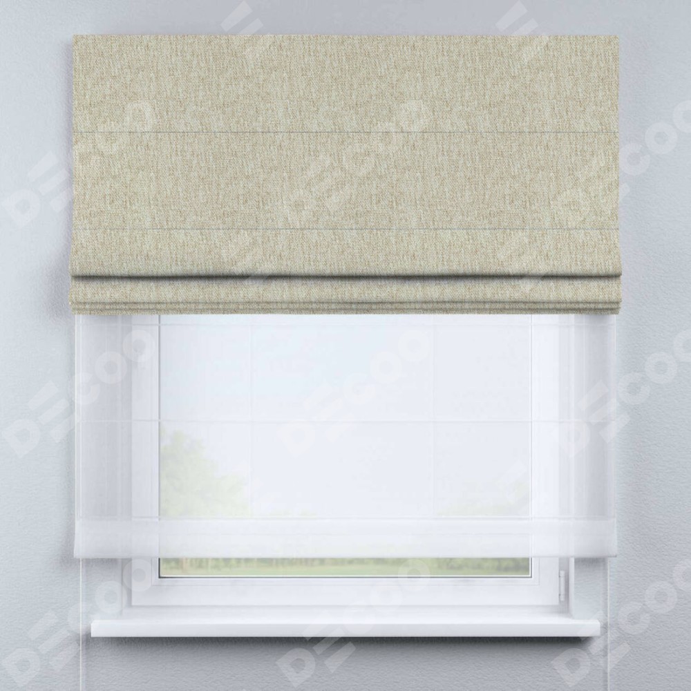 Римская штора день-ночь производителя «Cortin», используется для проёма, пошита из двух полотен, с лицевой стороны стиф димаут светло-бежевый артикул 18084, вторая ткань тюль (по стандарту комплектуется тюль белого цвета артикул V-01). Имеет универсальный механизм и подходит для монтажа: на потолок, на стену и в нишу.