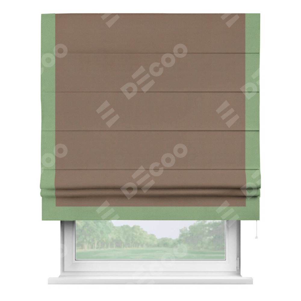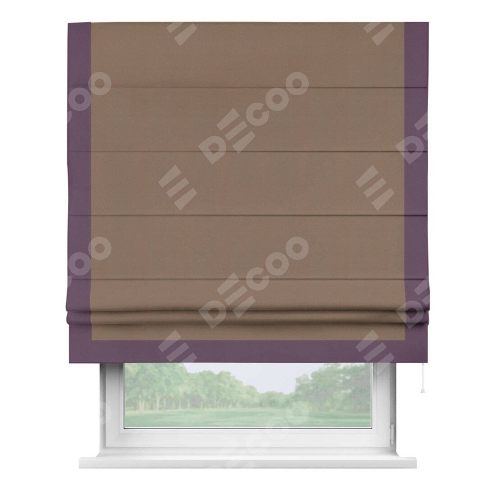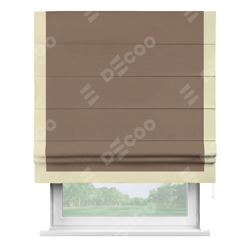Римская штора производителя «Cortin», используется для проёма, пошита из ткани блэкаут однотонный коричневый, артикул ткани 88285. Отделка шторы кантом «Виктория», ткань для канта используется из блэкаута однотонного разной расцветки на выбор. Имеет универсальный механизм и подходит для монтажа: на потолок, на стену и в нишу.