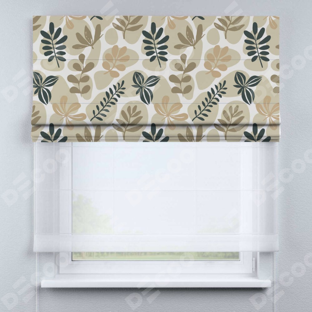 Римская штора день-ночь производителя «Cortin», используется для проёма, пошита из двух полотен, с лицевой блэкаут с нанесением сублимационной печати «Бежевый сад», вторая ткань тюль (по стандарту комплектуется тюль белого цвета артикул V-01). Имеет универсальный механизм и подходит для монтажа: на потолок, на стену и в нишу.
