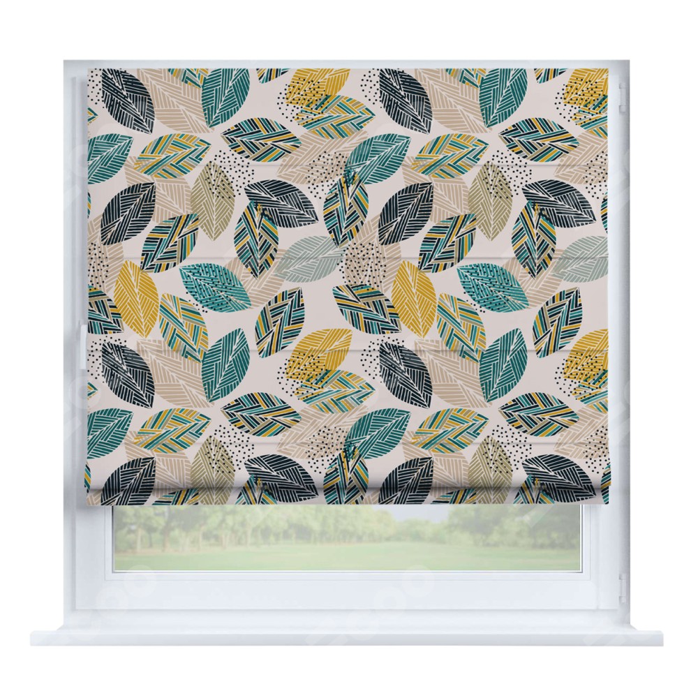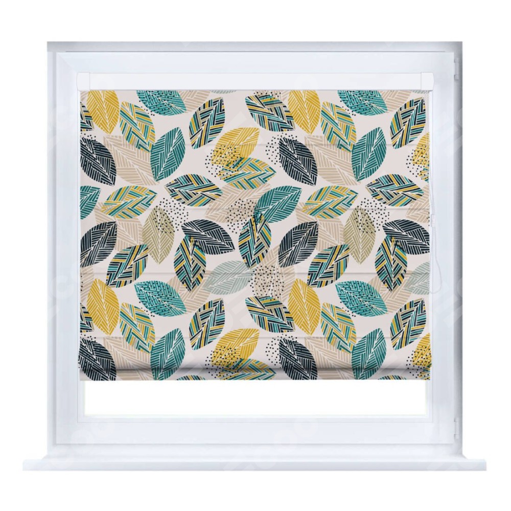 Римская штора производителя «Cortin», устанавливается на створку окна, пошита из ткани блэкаут с нанесением сублимационной печати «Листья с орнаментом». Штора шьётся по индивидуальным размерам, для данного типа римской шторы возможная ширина от 35 до 150 см., высота до 250 см.