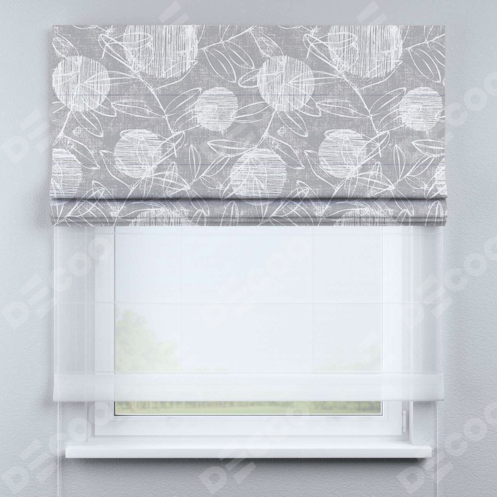 Римская штора день-ночь производителя «Cortin», используется для проёма, пошита из двух полотен, с лицевой блэкаут с нанесением сублимационной печати «Серо-белая фантазия», вторая ткань тюль (по стандарту комплектуется тюль белого цвета артикул V-01). Имеет универсальный механизм и подходит для монтажа: на потолок, на стену и в нишу.