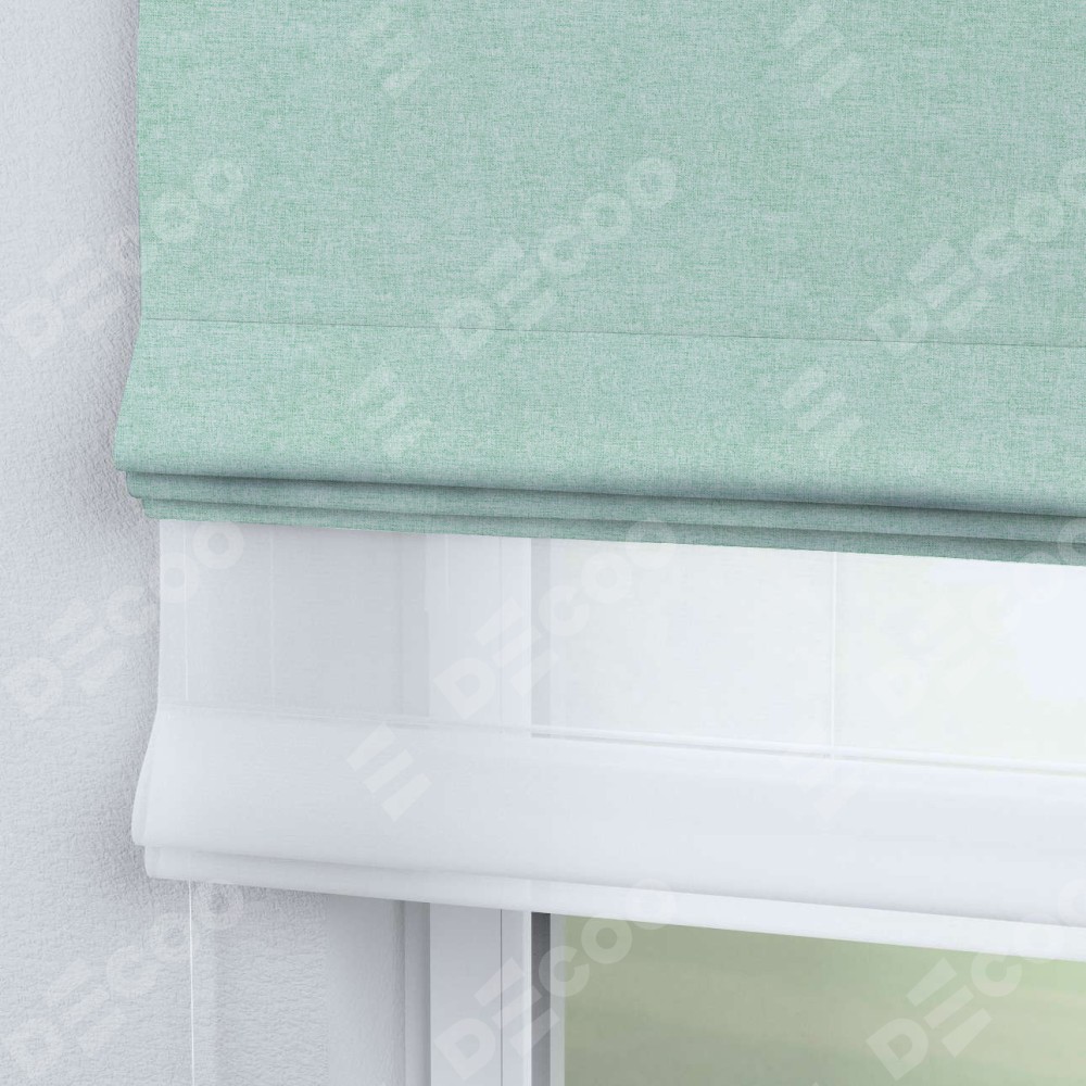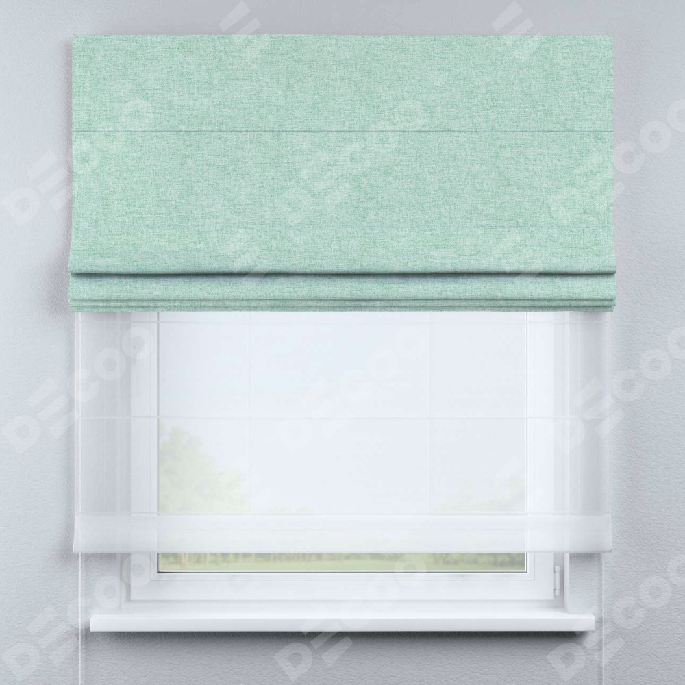 Римская штора день-ночь производителя «Cortin», используется для проёма, пошита из двух полотен, с лицевой стороны лён кашемир мятный артикул 21617, вторая ткань тюль (по стандарту комплектуется тюль белого цвета артикул V-01). Имеет универсальный механизм и подходит для монтажа: на потолок, на стену и в нишу.