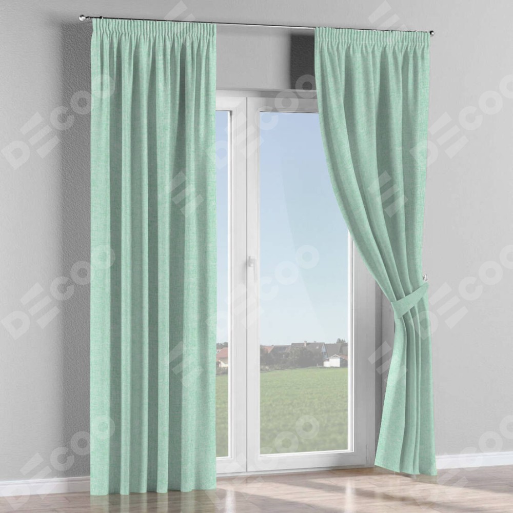 Комплект прямых штор, от производителя «Cortin», пошиты из ткани лён кашемир мятный, артикул ткани 21617. С изнаночной стороны в верхней части штор пристрачивается шторная лента с декоративными складками «Карандаш». Для создания элегантных складок прямые шторы шьются по стандарту с коэффициентом 1:2 (на 100 см. ширины проёма 200 см. ширины ткани).