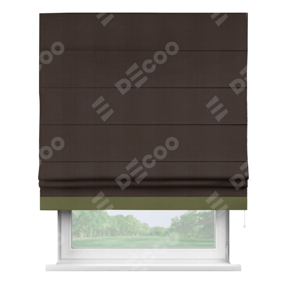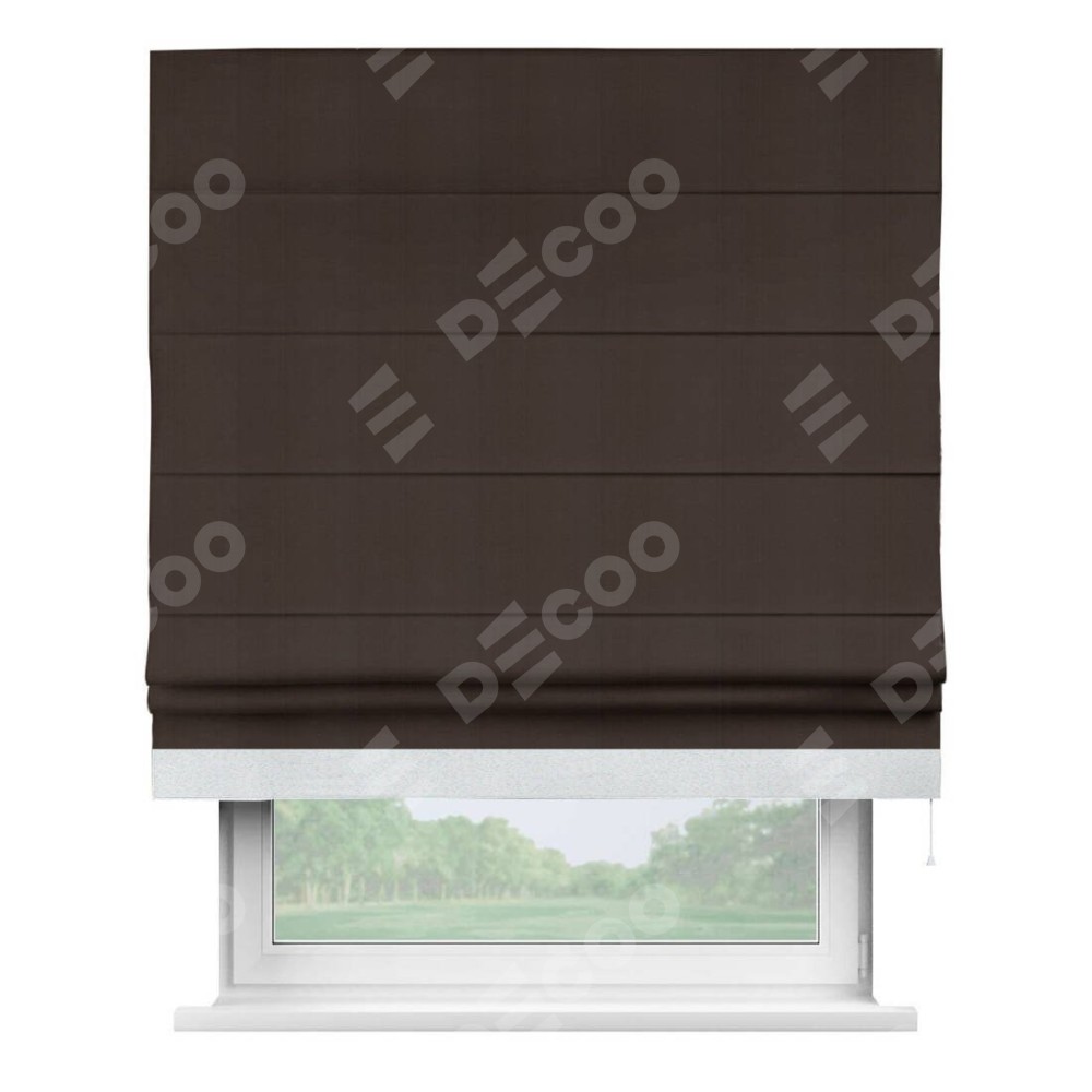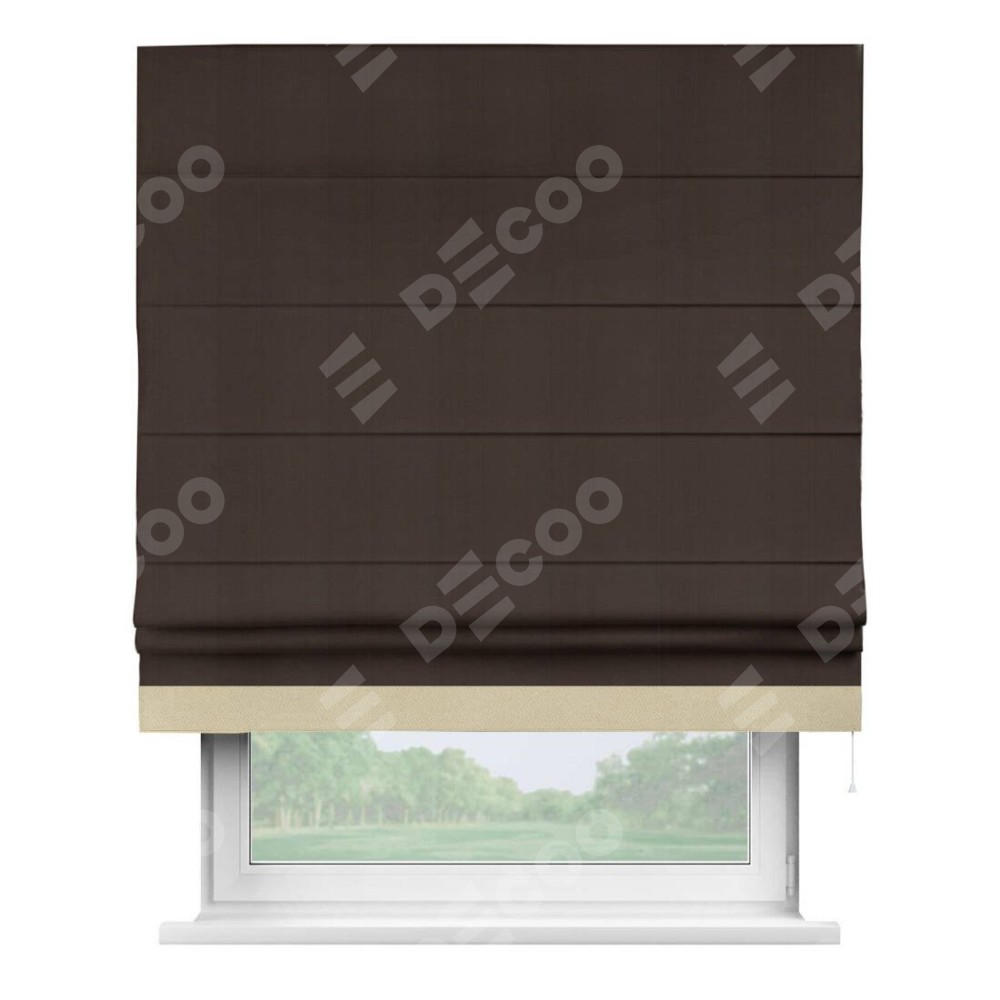 Римская штора производителя «Cortin», используется для проёма, пошита из ткани блэкаут однотонный тёмно-коричневый, артикул ткани 88287. Отделка шторы кантом «Джестер», ткань для канта используется из блэкаута однотонного разной расцветки на выбор. Имеет универсальный механизм и подходит для монтажа: на потолок, на стену и в нишу.