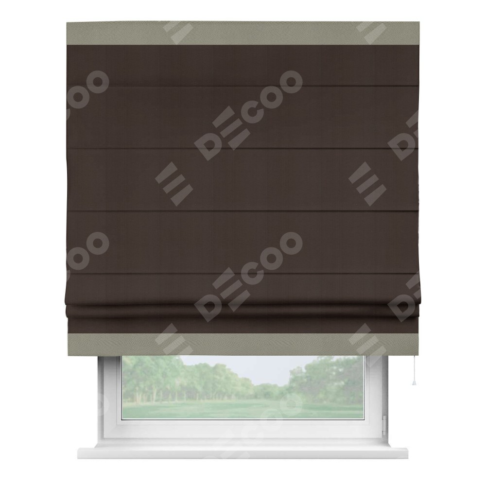 Римская штора производителя «Cortin», используется для проёма, пошита из ткани блэкаут однотонный тёмно-коричневый, артикул ткани 88287. Отделка шторы кантом «Горизонт», ткань для канта используется из блэкаута однотонного разной расцветки на выбор. Имеет универсальный механизм и подходит для монтажа: на потолок, на стену и в нишу.
