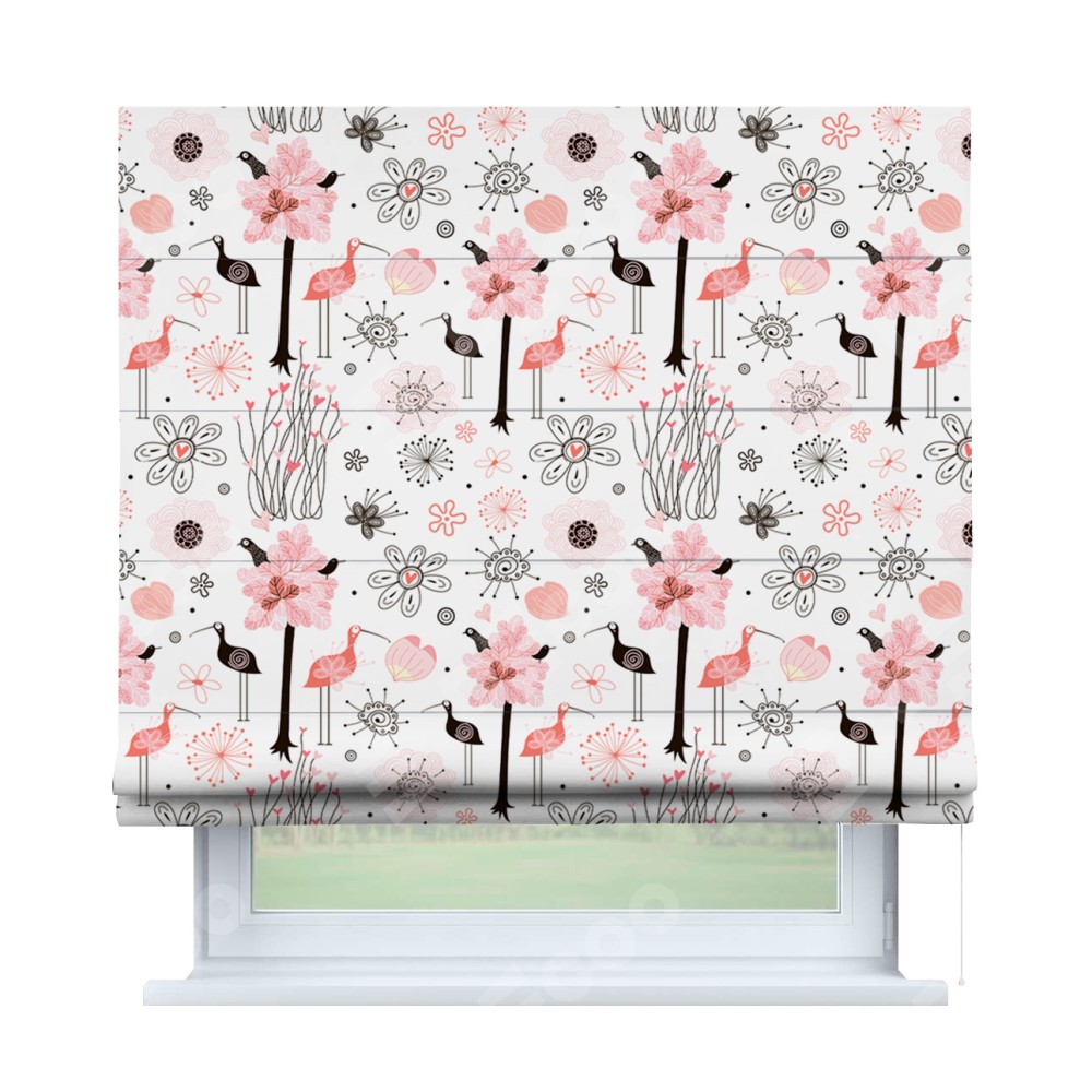 Римская штора производителя «Cortin», используется для проёма, пошита из ткани блэкаут с нанесением сублимационной печати «Любопытные птички». Имеет универсальный механизм и подходит для монтажа: на потолок, на стену и в нишу.
