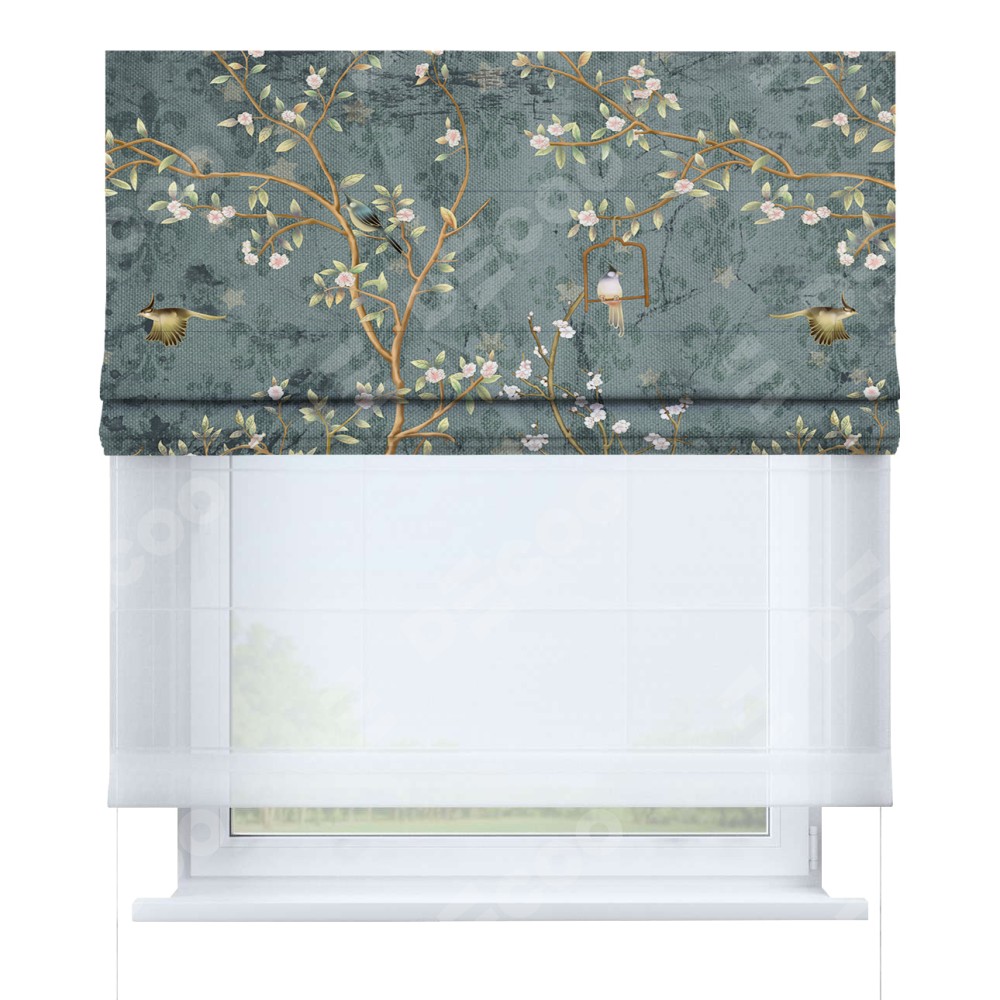 Римская штора день-ночь производителя «Cortin», используется для проёма, пошита из двух полотен, с лицевой блэкаут с нанесением сублимационной печати «Тенистый сад», вторая ткань тюль (по стандарту комплектуется тюль белого цвета артикул V-01). Имеет универсальный механизм и подходит для монтажа: на потолок, на стену и в нишу.