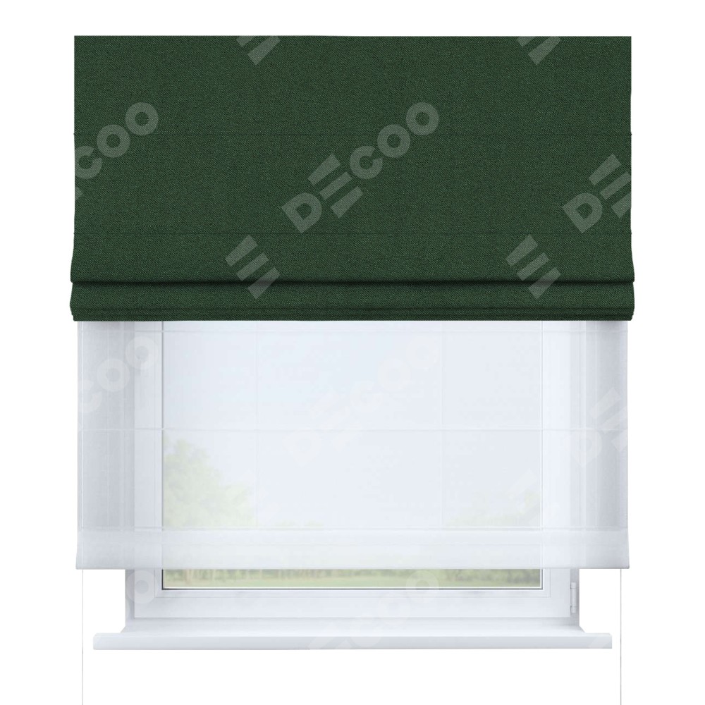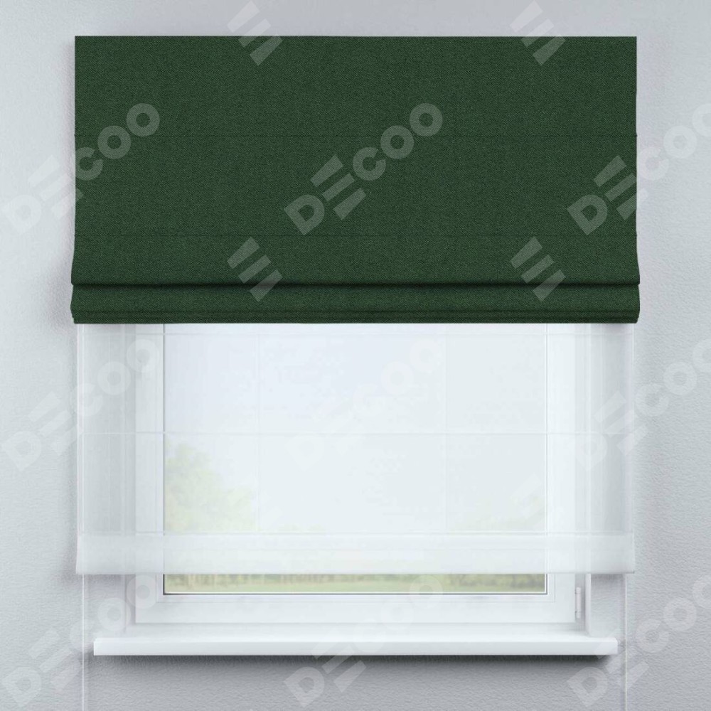 Римская штора день-ночь производителя «Cortin», используется для проёма, пошита из двух полотен, с лицевой стороны лён блэкаут зелёный артикул 69497, вторая ткань тюль (по стандарту комплектуется тюль белого цвета артикул V-01). Имеет универсальный механизм и подходит для монтажа: на потолок, на стену и в нишу.