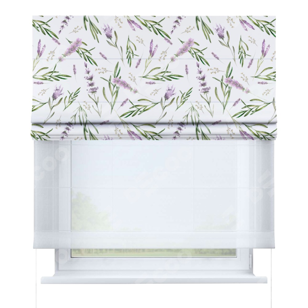 Римская штора день-ночь производителя «Cortin», используется для проёма, пошита из двух полотен, с лицевой блэкаут с нанесением сублимационной печати «Лавандовое поле», вторая ткань тюль (по стандарту комплектуется тюль белого цвета артикул V-01). Имеет универсальный механизм и подходит для монтажа: на потолок, на стену и в нишу.