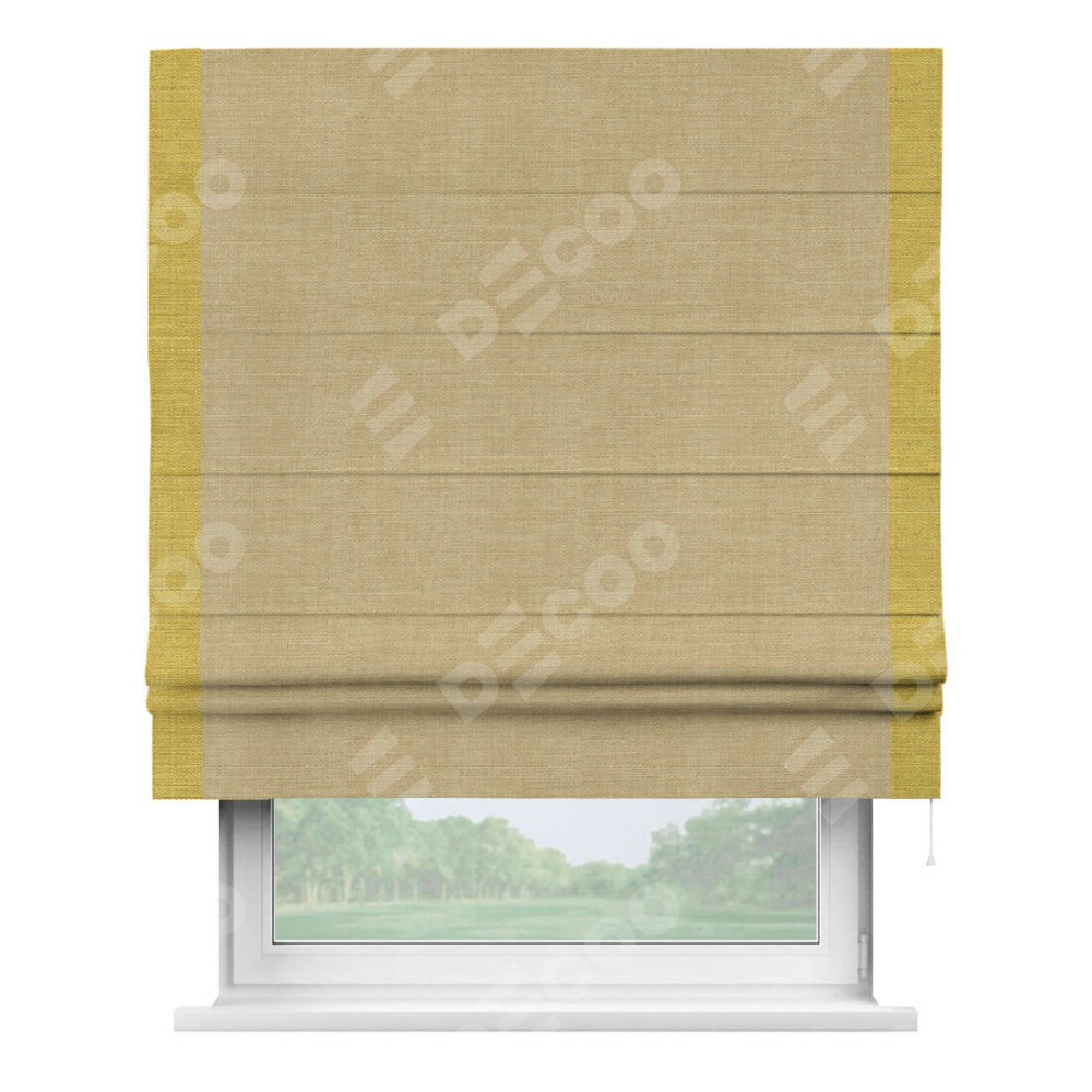 Римская штора производителя «Cortin», используется для проёма, пошита из ткани лён бежевый, артикул 7442. Отделка шторы кантом «Стрим Дуо», ткань для канта используется из льна разной расцветки на выбор. Имеет универсальный механизм и подходит для монтажа: на потолок, на стену и в нишу.