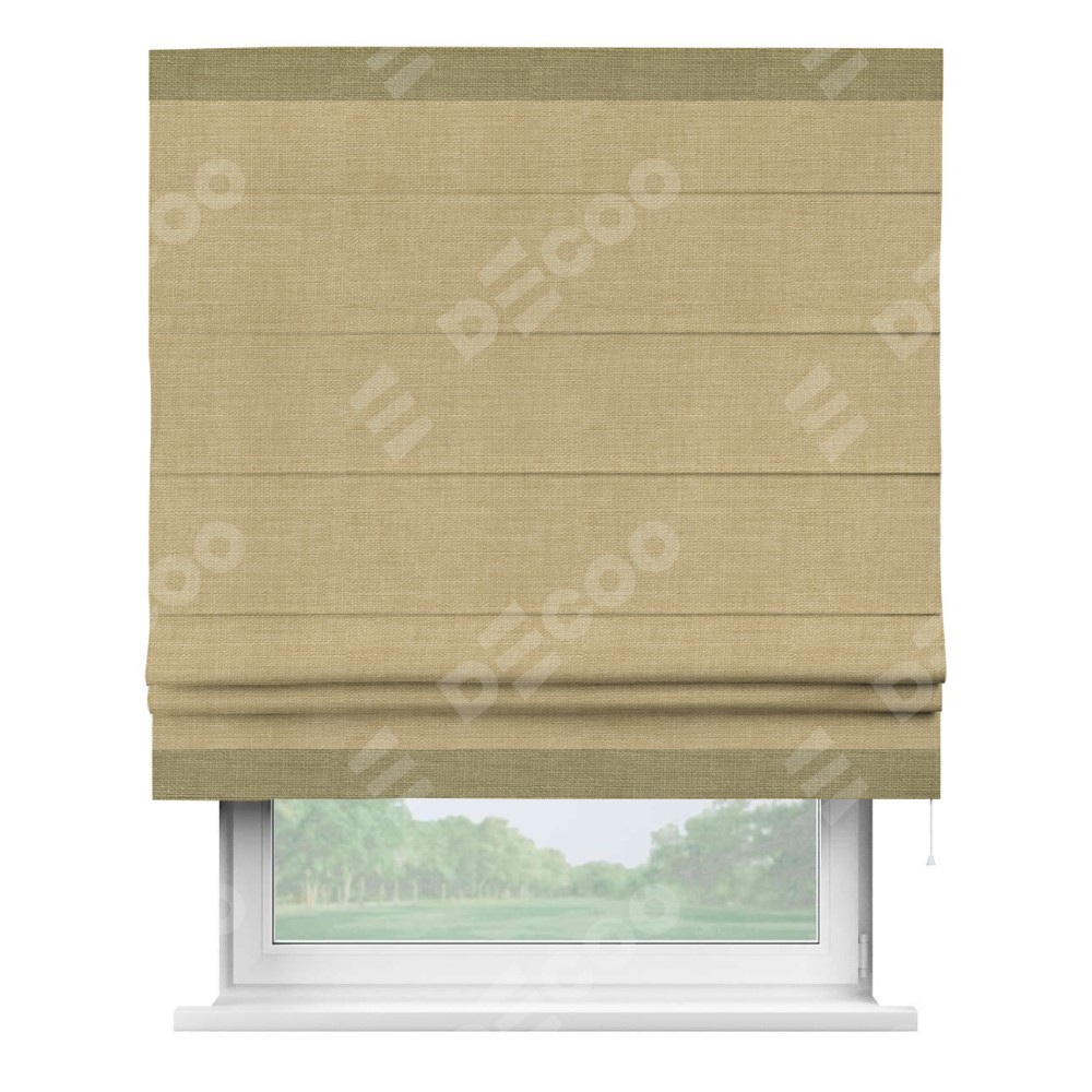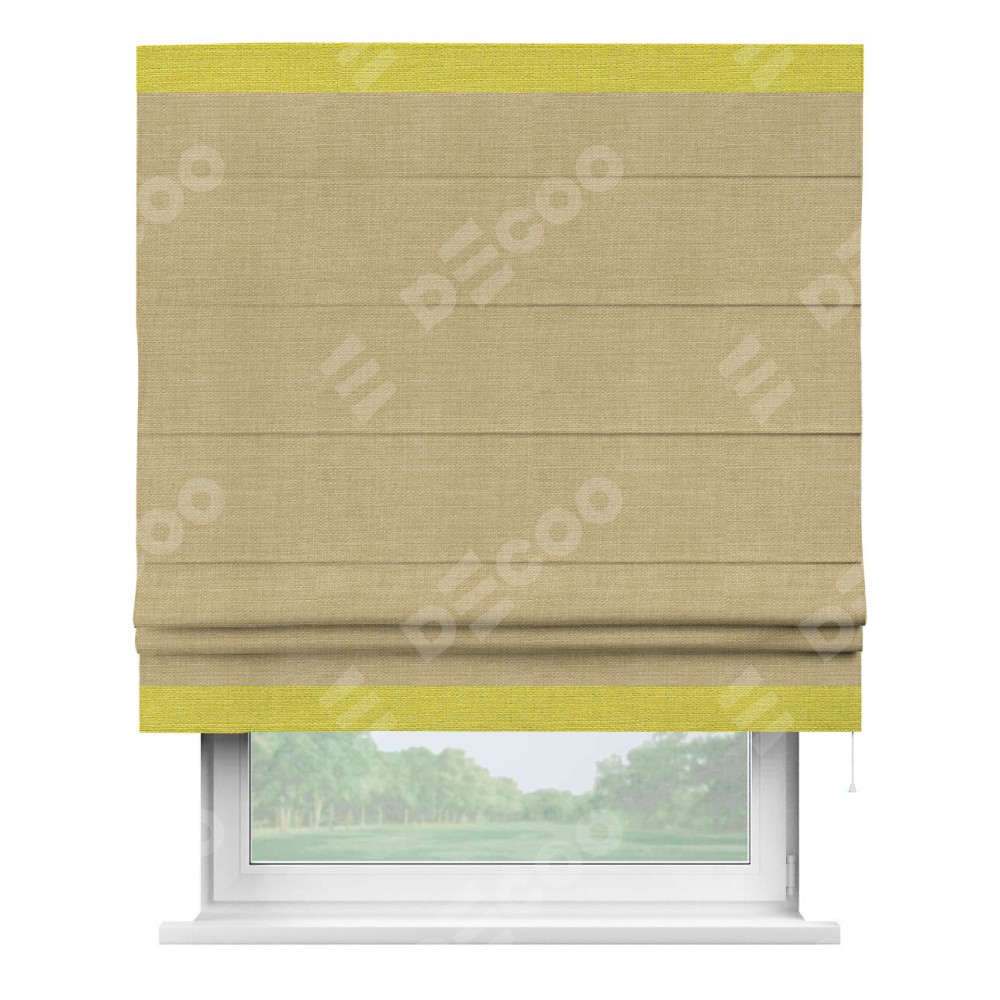 Римская штора производителя «Cortin», используется для проёма, пошита из ткани лён бежевый, артикул 7442. Отделка шторы кантом «Горизонт», ткань для канта используется из льна разной расцветки на выбор. Имеет универсальный механизм и подходит для монтажа: на потолок, на стену и в нишу.