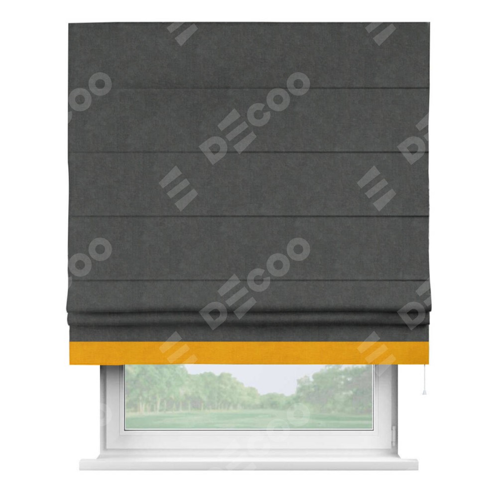 Римская штора производителя «Cortin», используется для проёма, пошита из ткани вельвет тёмно-серый, артикул ткани 33811. Отделка шторы кантом «Джестер», ткань для канта используется из вельвета разной расцветки на выбор. Имеет универсальный механизм и подходит для монтажа: на потолок, на стену и в нишу.
