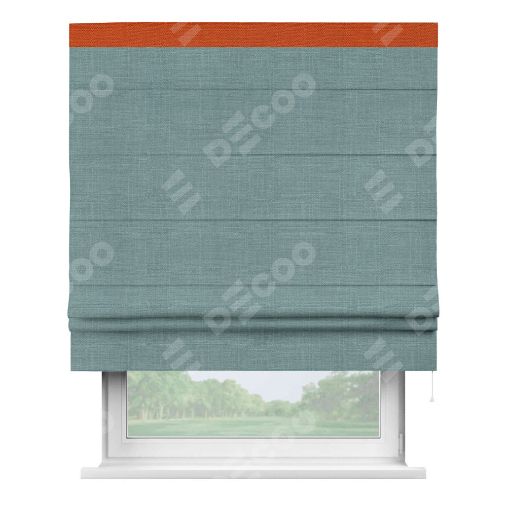 Римская штора производителя «Cortin», используется для проёма, пошита из ткани лён голубой, артикул 74 736. Отделка шторы кантом «Кинг», ткань для канта используется из льна разной расцветки на выбор. Имеет универсальный механизм и подходит для монтажа: на потолок, на стену и в нишу.