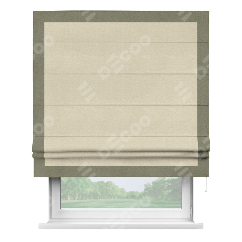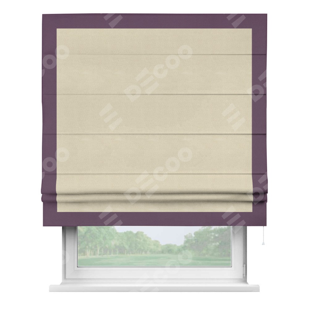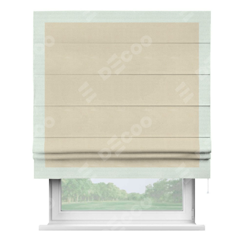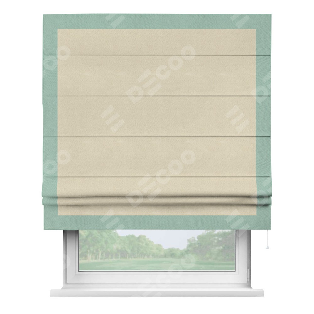 Римская штора производителя «Cortin», используется для проёма, пошита из ткани блэкаут однотонный бежевый, артикул ткани 13125. Отделка шторы кантом «Чесс», ткань для канта используется из блэкаута однотонного разной расцветки на выбор. Имеет универсальный механизм и подходит для монтажа: на потолок, на стену и в нишу.
