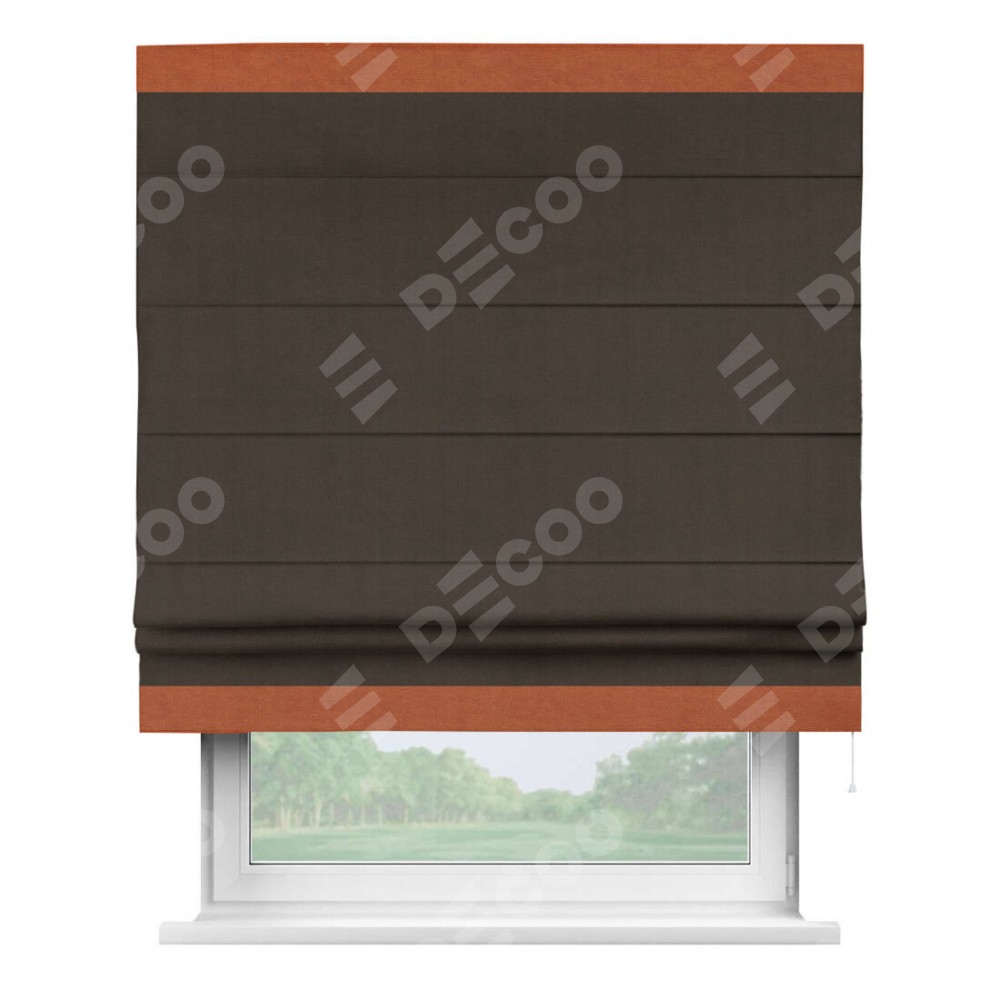 Римская штора производителя «Cortin», используется для проёма, пошита из ткани вельвет тёмно-коричневый, артикул ткани 30991. Отделка шторы кантом «Горизонт», ткань для канта используется из вельвета разной расцветки на выбор. Имеет универсальный механизм и подходит для монтажа: на потолок, на стену и в нишу.