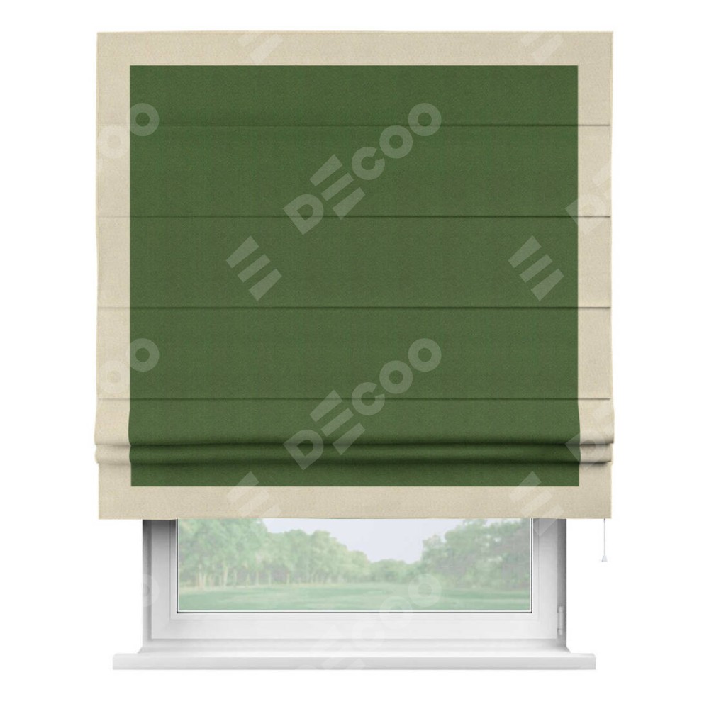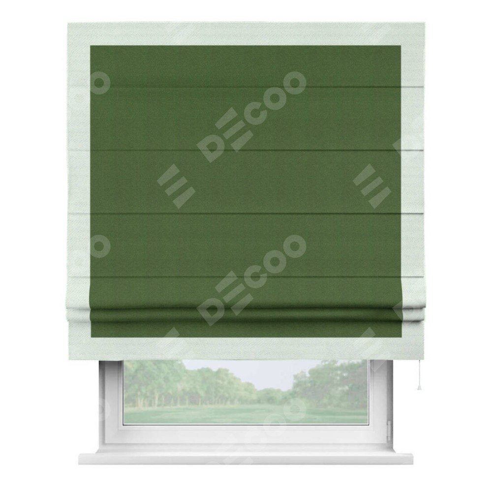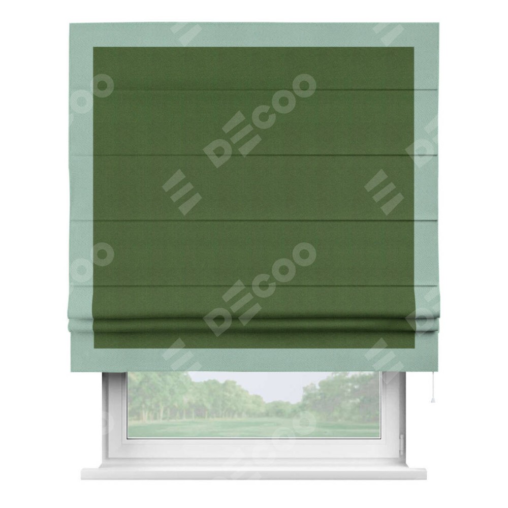 Римская штора производителя «Cortin», используется для проёма, пошита из ткани блэкаут однотонный зелёный перламутр, артикул ткани 81859−2. Отделка шторы кантом «Чесс», ткань для канта используется из блэкаута однотонного разной расцветки на выбор. Имеет универсальный механизм и подходит для монтажа: на потолок, на стену и в нишу.