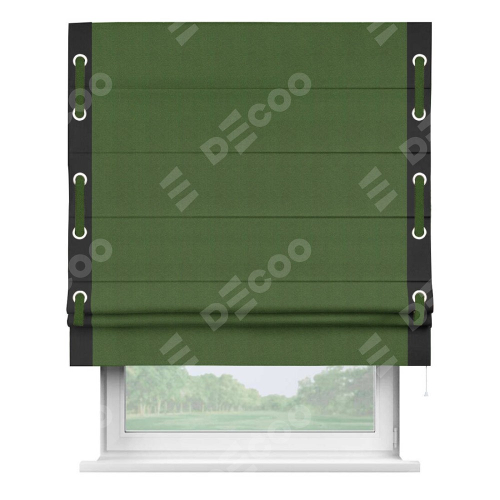 Римская штора производителя «Cortin», используется для проёма, пошита из ткани блэкаут однотонный зелёный перламутр, артикул ткани 81859−2. Отделка шторы кантом «Стрим Дуо» на кантах расположены люверсы с пояском, ткань для канта используется из блэкаута однотонного разной расцветки на выбор. Ткань для пояска обычно используется из основной ткани шторы, а так же можно сделать из любой расцветки по желанию. Имеет универсальный механизм и подходит для монтажа: на потолок, на стену и в нишу.