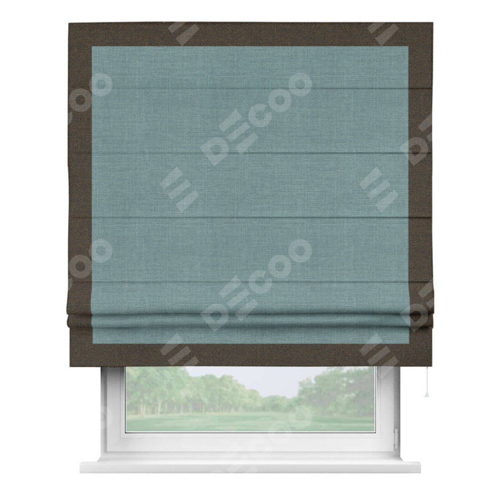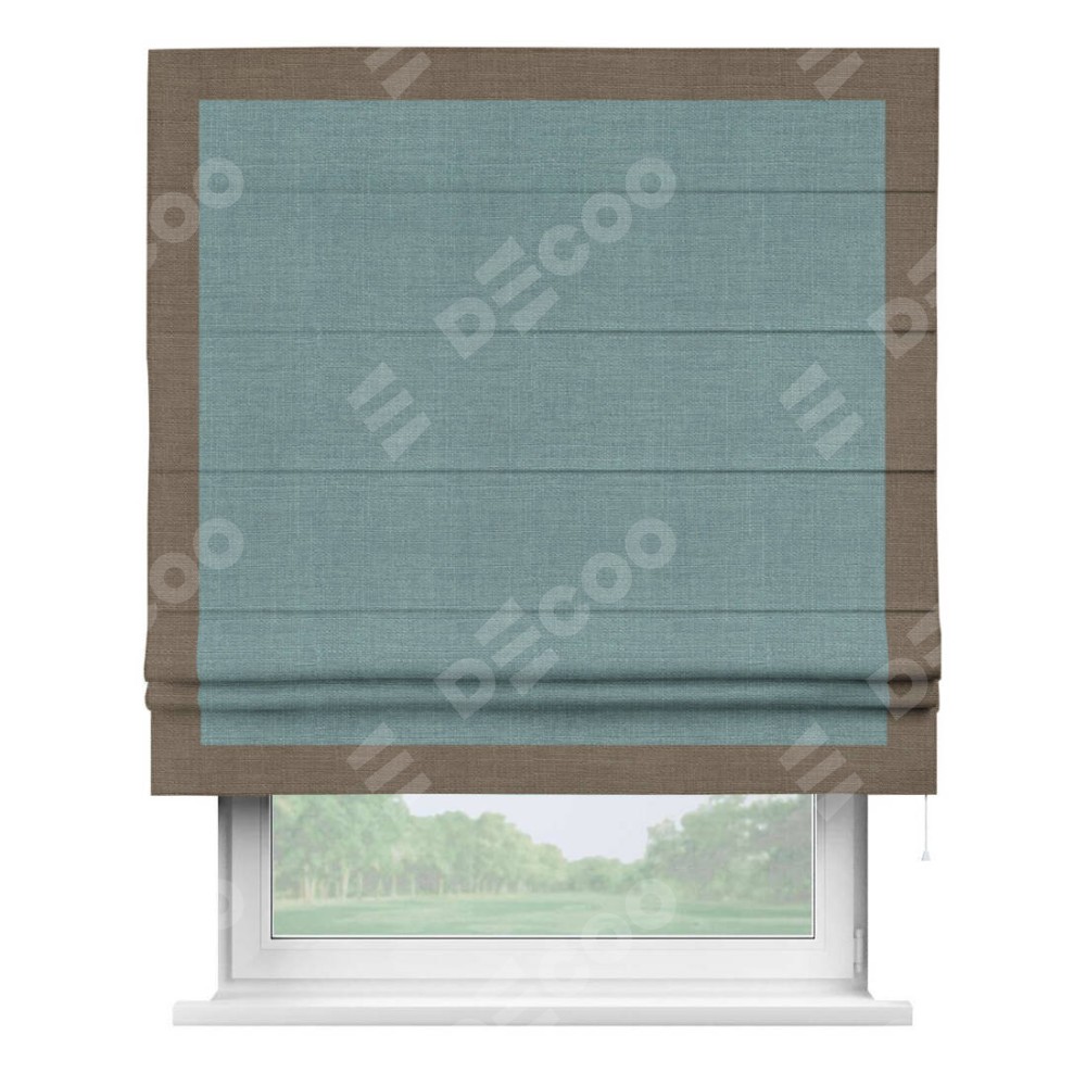 Римская штора производителя «Cortin», используется для проёма, пошита из ткани лён голубой, артикул 74736. Отделка шторы кантом «Чесс», ткань для канта используется из льна разной расцветки на выбор. Имеет универсальный механизм и подходит для монтажа: на потолок, на стену и в нишу.