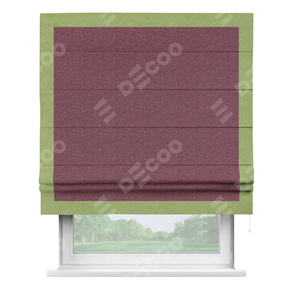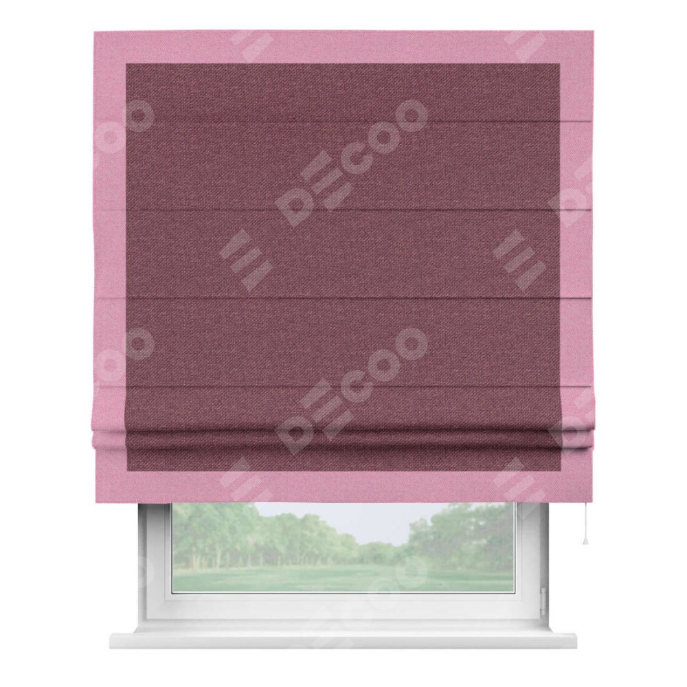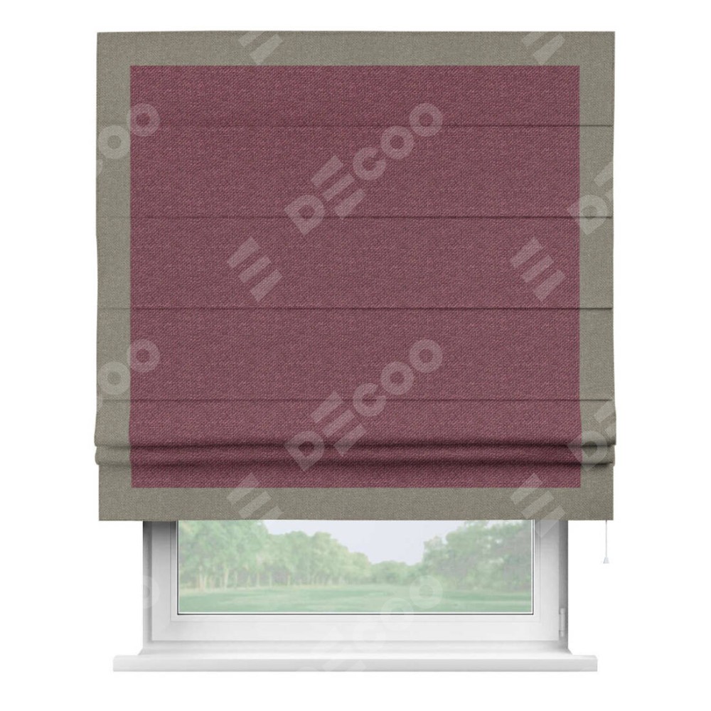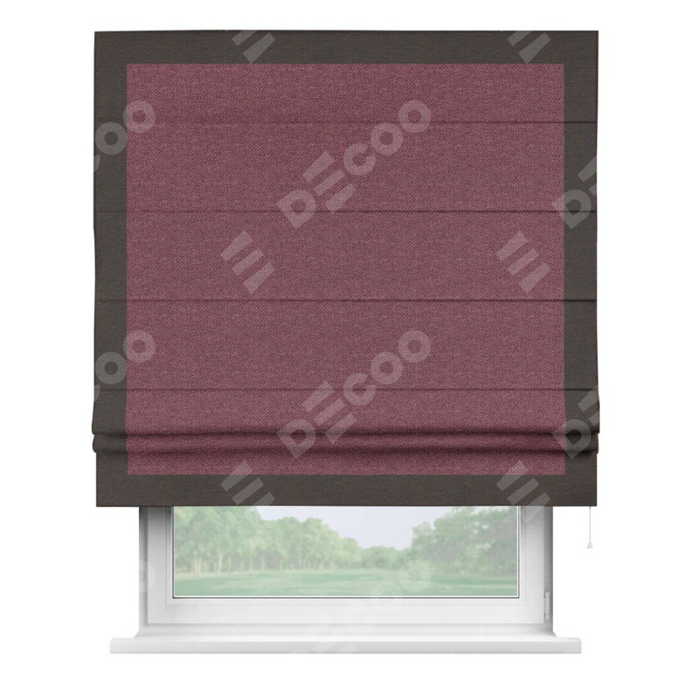 Римская штора производителя «Cortin», используется для проёма, пошита из ткани лён димаут марсала, артикул 1602. Отделка шторы кантом «Чесс», ткань для канта используется из льна димаут разной расцветки на выбор. Имеет универсальный механизм и подходит для монтажа: на потолок, на стену и в нишу.