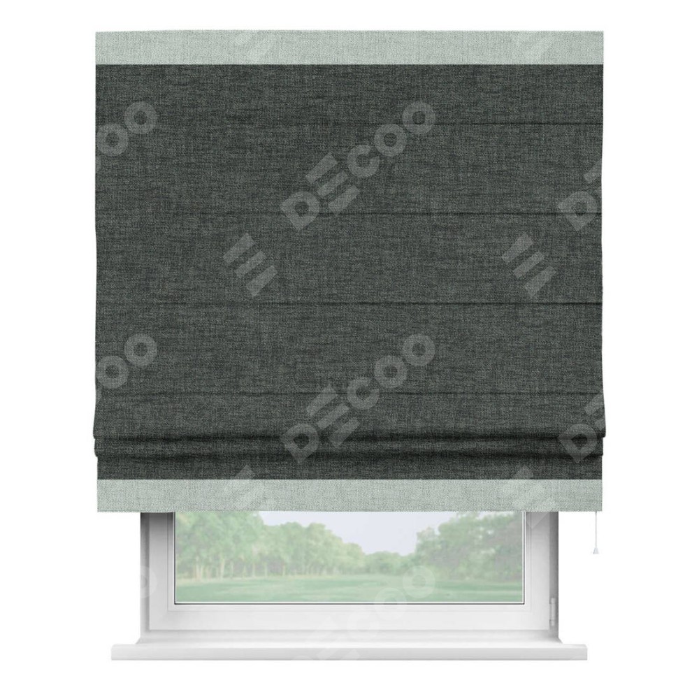 Римская штора производителя «Cortin», используется для проёма, пошита из ткани рогожка димаут графит, артикул 102−34. Отделка шторы кантом «Горизонт», ткань для канта используется из рогожки димаут разной расцветки на выбор. Имеет универсальный механизм и подходит для монтажа: на потолок, на стену и в нишу.