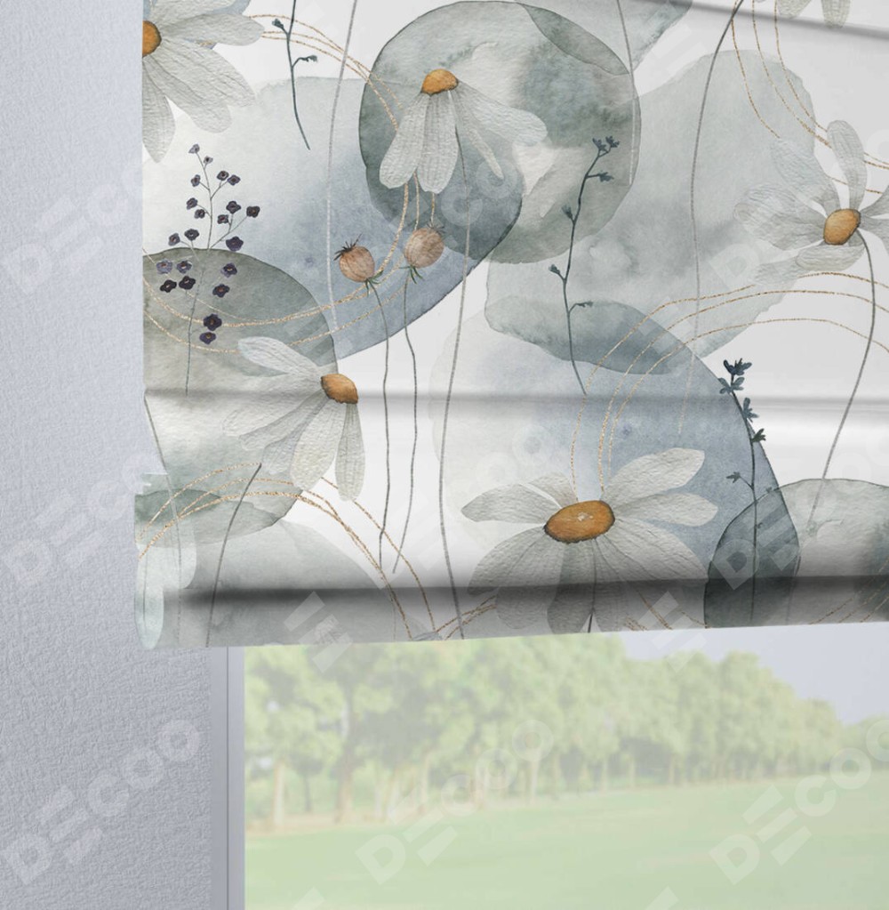 Римская штора производителя «Cortin», используется для проёма, пошита из ткани блэкаут с нанесением сублимационной печати «Ромашки акварель». Данная модель пошита на петлях, комплектуется на выбор круглым карнизом и подходит для монтажа на стену. Римская штора на петлях имеет простую систему регулировки высоты, отличительным преимуществом данной модели является простой способ монтажа. Достаточно повесить ее на трубу и штора готова!