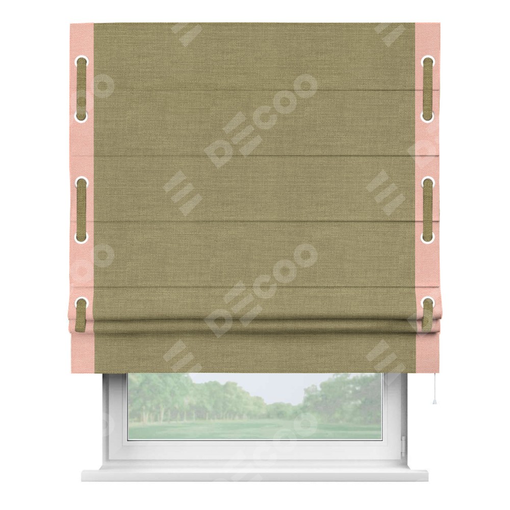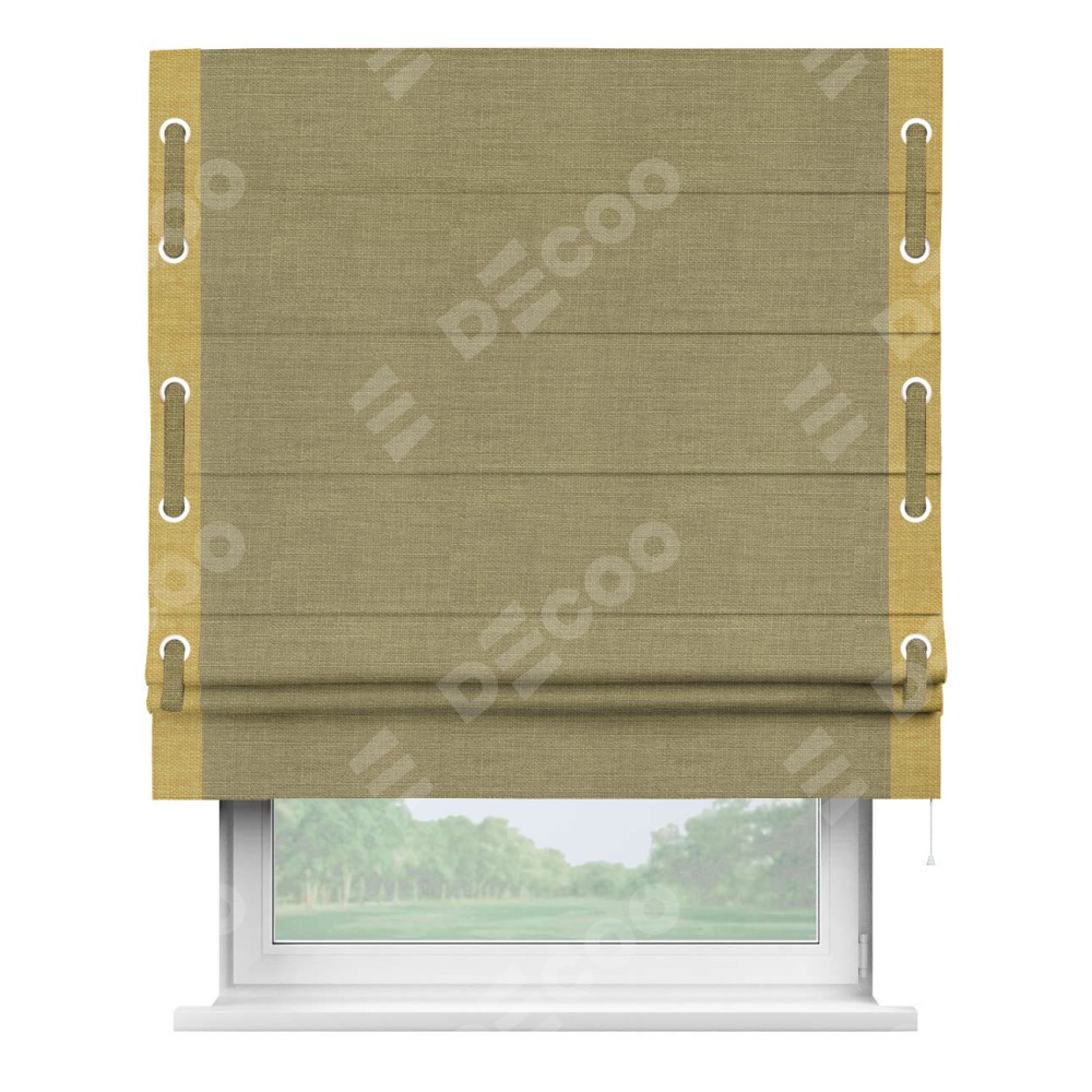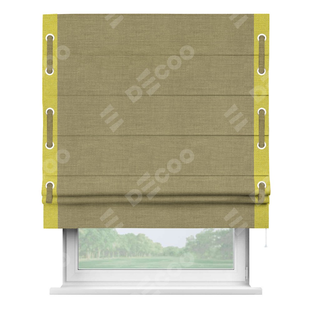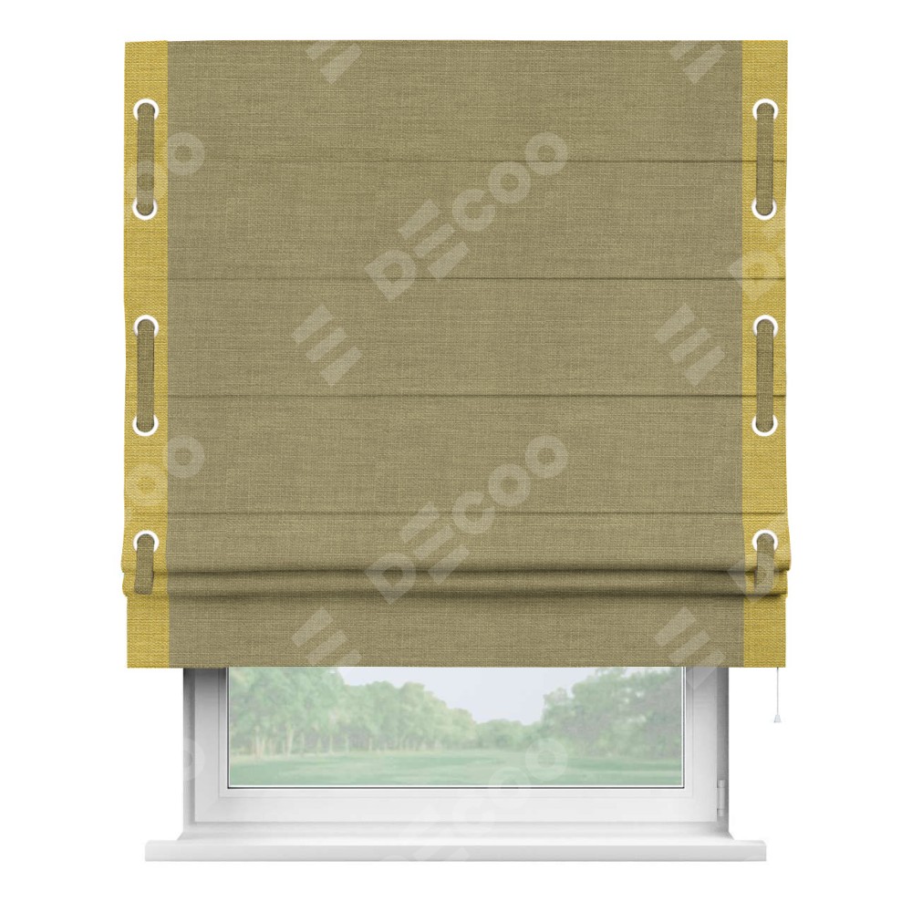 Римская штора производителя «Cortin», используется для проёма, пошита из ткани лён коричневый, артикул 7443. Отделка шторы кантом «Стрим Дуо» на кантах расположены люверсы с пояском, ткань для канта используется из льна разной расцветки на выбор. Ткань для пояска обычно используется из основной ткани шторы, а так же можно сделать из любой расцветки по желанию. Имеет универсальный механизм и подходит для монтажа: на потолок, на стену и в нишу.