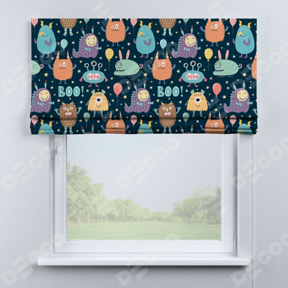 Римская штора производителя «Cortin», используется для проёма, пошита из ткани блэкаут с нанесением сублимационной печати «Звёздные страшилки». Имеет универсальный механизм и подходит для монтажа: на потолок, на стену и в нишу.