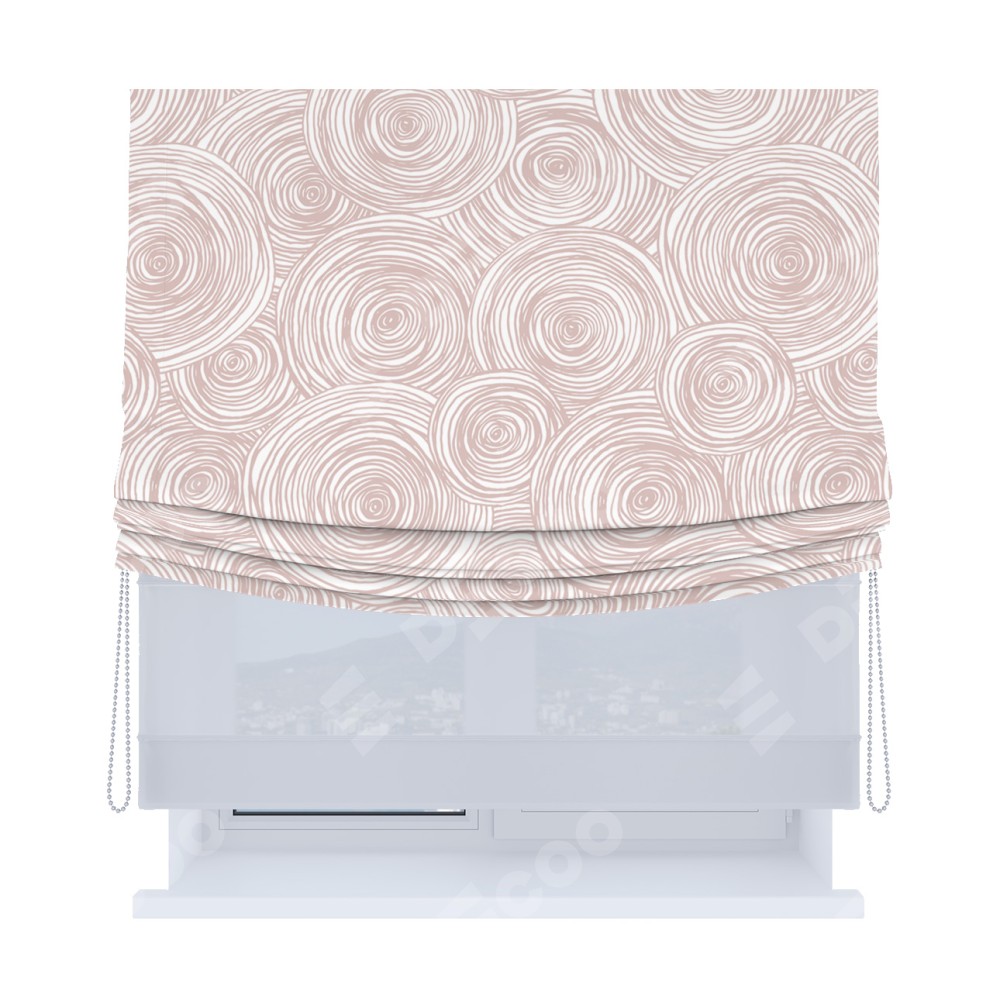 Римская штора день-ночь производителя «Cortin», используется для проёма, пошита из двух полотен, с лицевой блэкаут с нанесением сублимационной печати «Бежевые круги», вторая ткань тюль (по стандарту комплектуется тюль белого цвета артикул V-01). Имеет универсальный механизм и подходит для монтажа: на потолок, на стену и в нишу. Удобное управление каждой шторой отдельно.