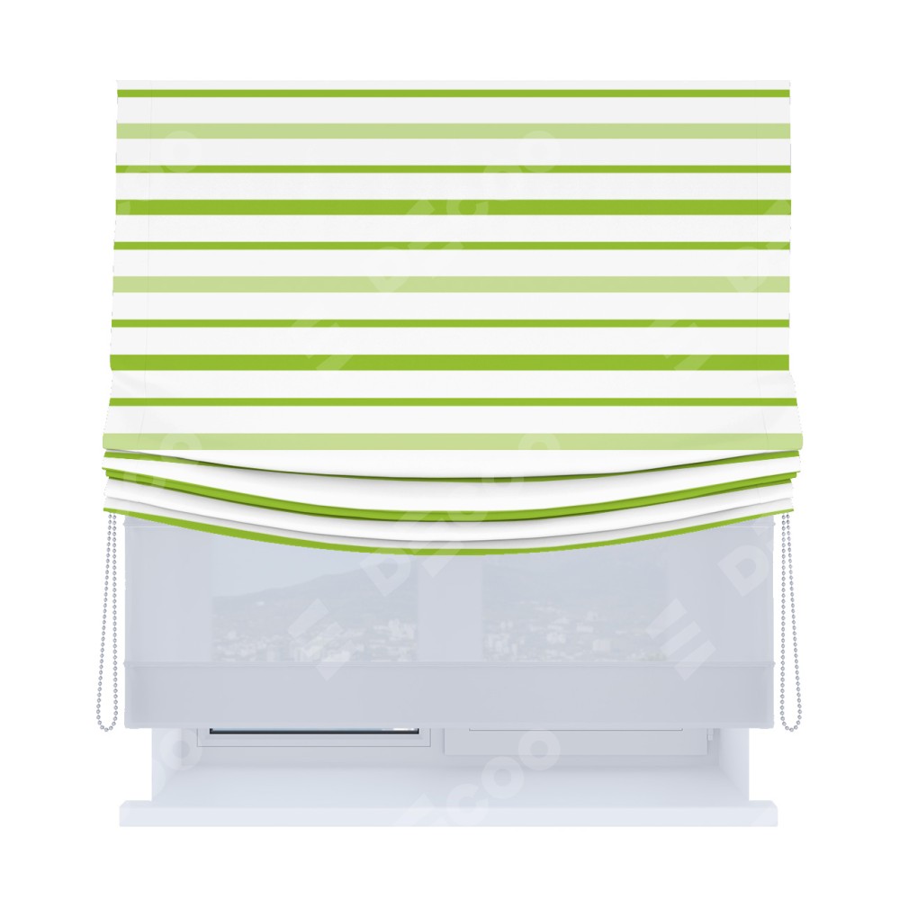 Римская штора день-ночь производителя «Cortin», используется для проёма, пошита из двух полотен, с лицевой блэкаут с нанесением сублимационной печати «Зелёные горизонтальные полоски», вторая ткань тюль (по стандарту комплектуется тюль белого цвета артикул V-01). Имеет универсальный механизм и подходит для монтажа: на потолок, на стену и в нишу. Удобное управление каждой шторой отдельно.